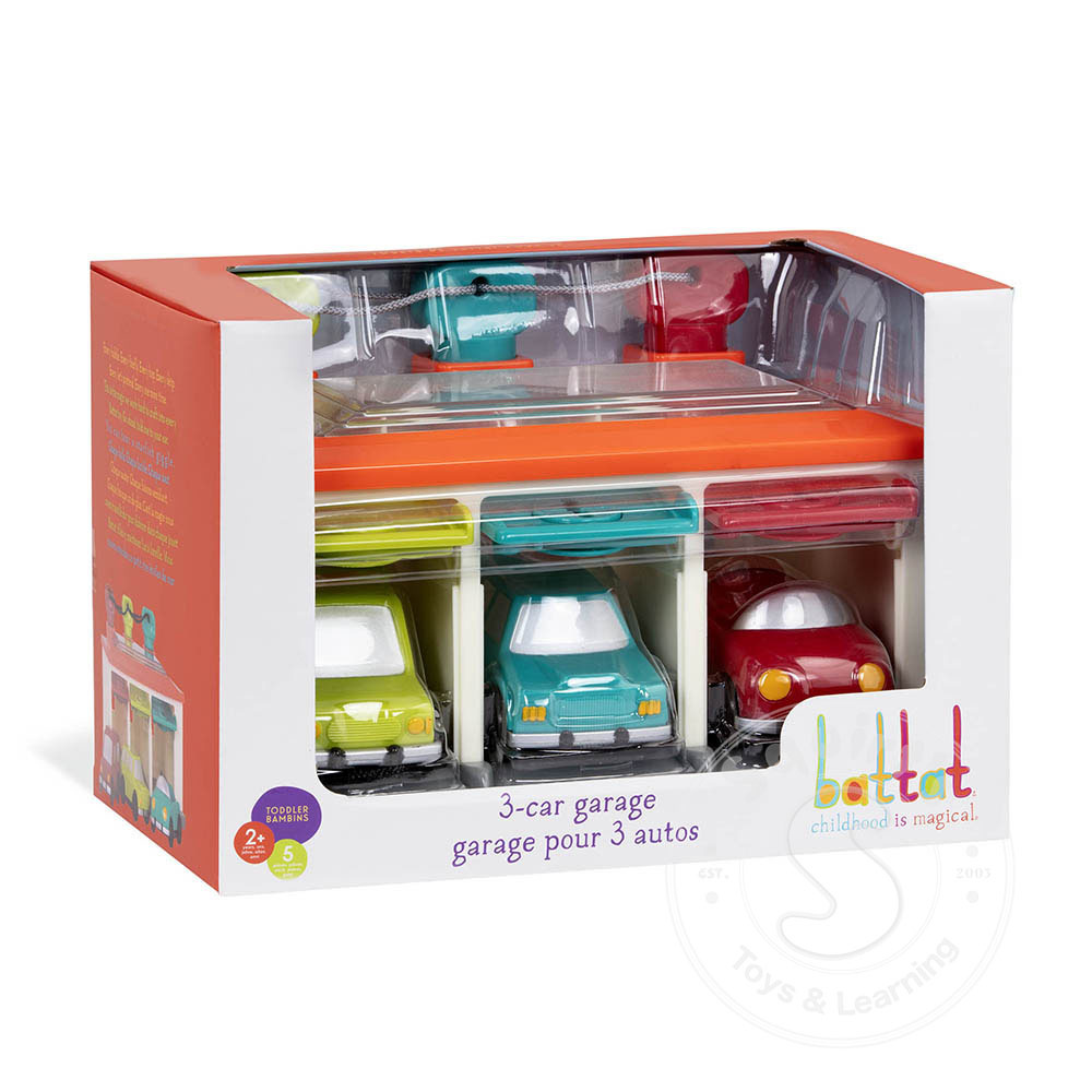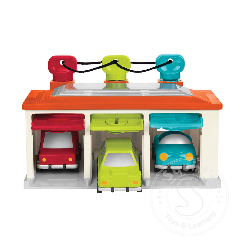 Battat 3 car garage is a take-along garage playset that comes with a set of 3 keys, shape and color sorting features and 3 different cars ready to roll! Match the colored keys to unlock the doors, lift it open and press the push-button to release the...