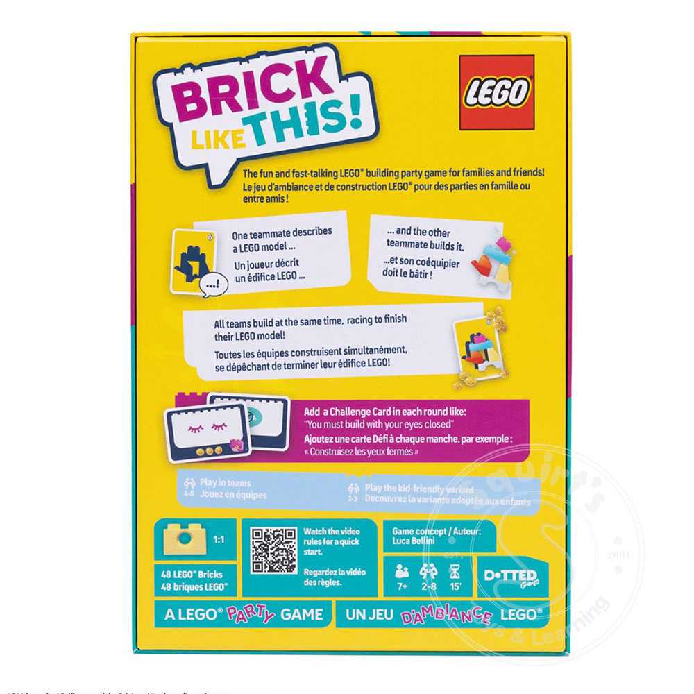 In Brick Like This! Teams of two, one Instructor and one Builder, are tasked with building a shape out of LEGO bricks. The Instructor will tell the Builder how to build a shape on a Shape Card that only the Instructor can see. All teams play at...