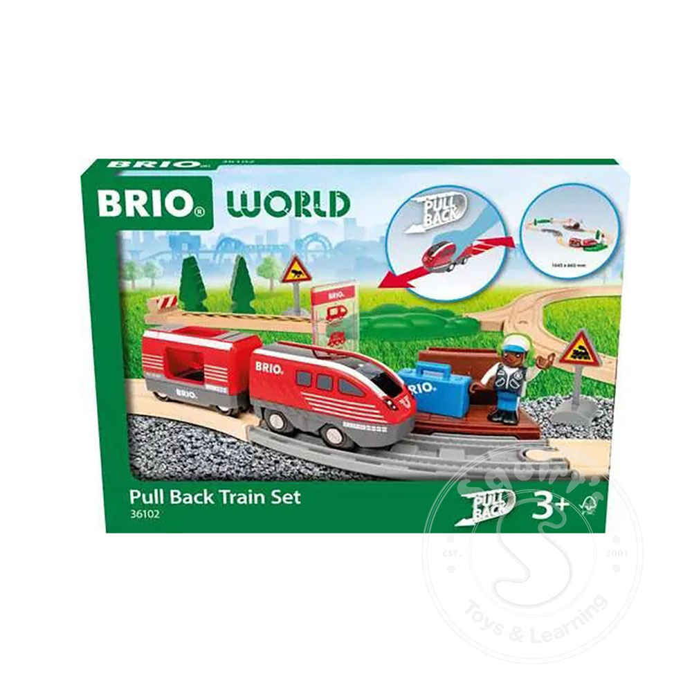 Keep the fun going with the 36102 Pull Back Train Set. Powered by 100% toddler energy, this toy train needs no batteries to bring big smiles to little faces. Let the passenger board at the station, draw back the red train and watch it go. When it slows...