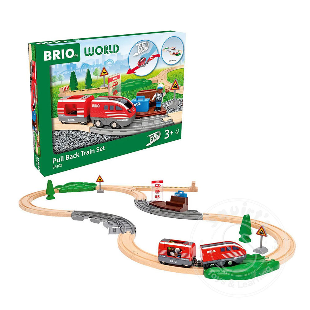 36102 Pull Back Train Set includes 28 pieces: 1x Pull Back Train, 1x Travel Passenger Wagon, 1x Travel Figure, 1x Station Platform, 4x Station Platform Tracks, 2x Wooden Trees, 2x Scenic Tracks, 12x Wooden Track Pieces and multiple accessories