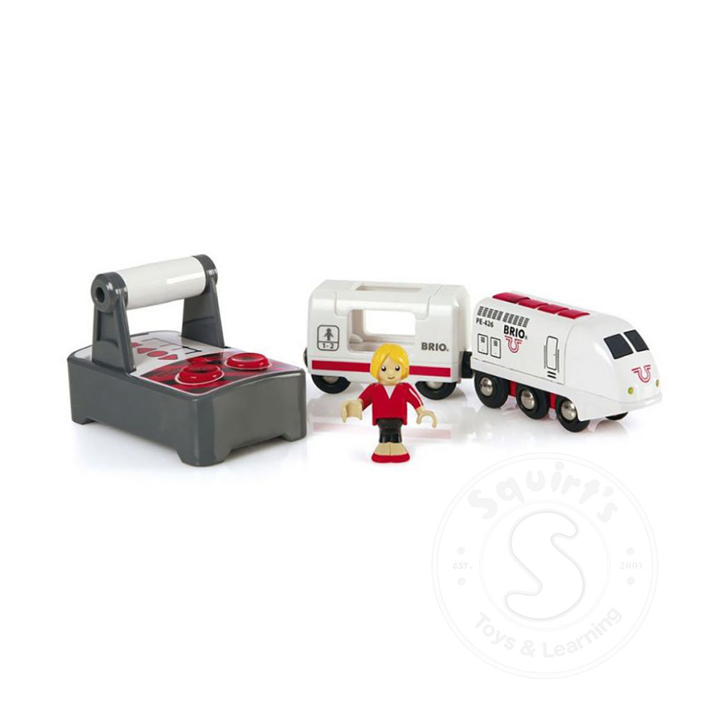Take control and drive safely, you have a passenger onboard! The unique controller has easy to use reverse and stop functions as well as two different forward speeds as well as A&B frequencies to allow for multiple RC trains on the same layout...