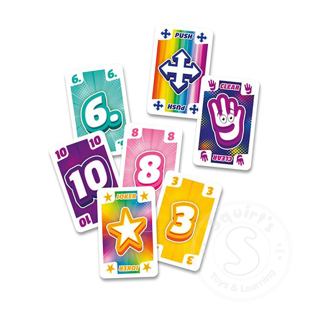 In this fast-paced card shedding game, you must always play matching or lower numbers. lt helps to play 4 of the same card, because then you get to CLEAR! the center of the table and go again. This is also the best way to get rid of your face-down cards!.