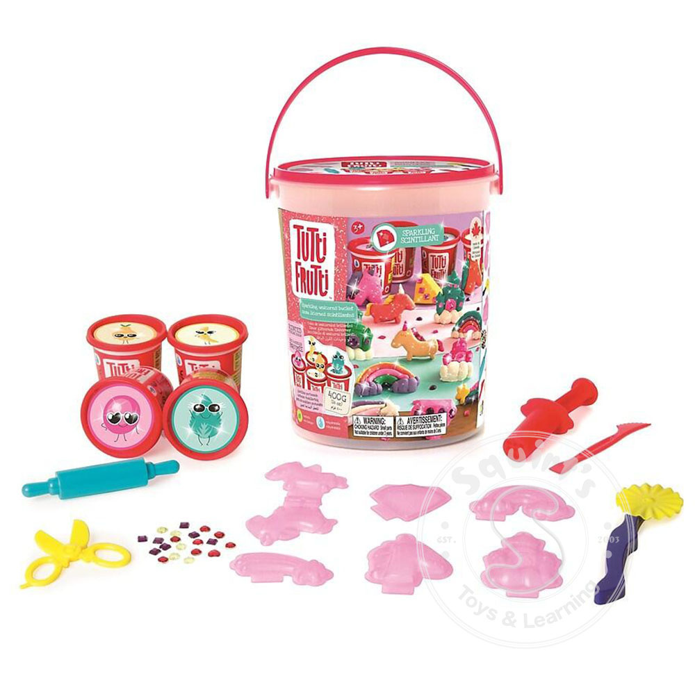 The Tutti Frutti Sparkling Unicorns Bucket Set includes rainbows, castles, unicorns, shooting stars and the large unicorn head that can all be brought to life using the included molds and kitchen utensils, as well as the deliciously scented sparkling...