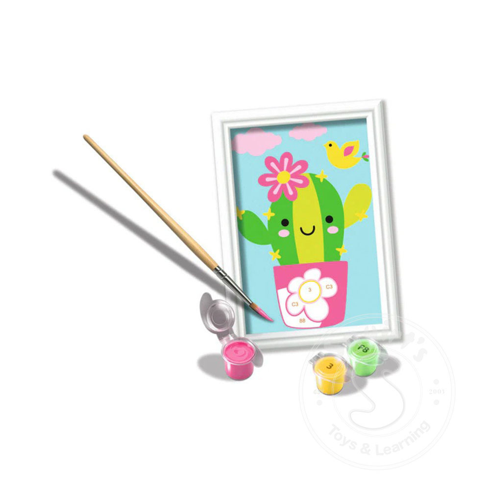 The painting set contains 6 acrylic paints in resealable, numbered bowls, a painting board in the format 8.5 x 12 cm, a frame and a brush. The colours dry quickly, are water-based, odourless and do not require a brush cleaner