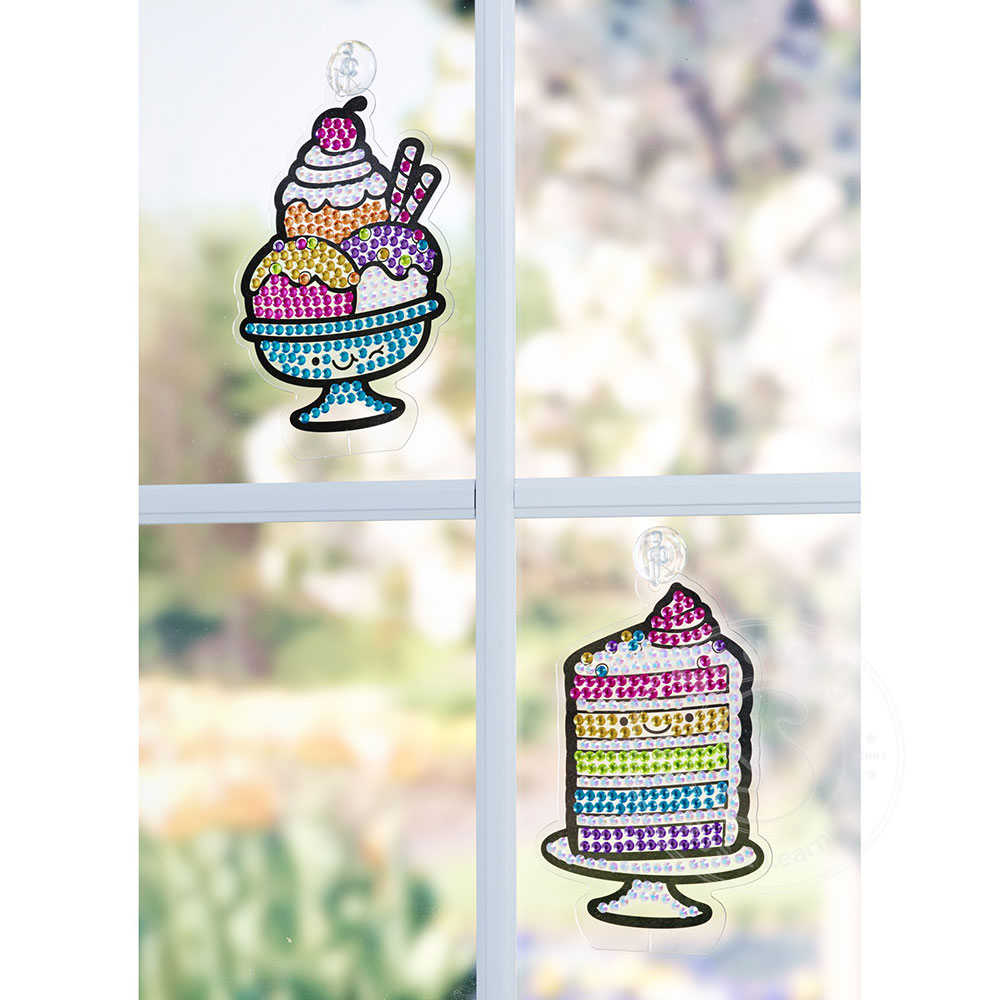 two diamond painting activities in one kit: 12 holographic stickers include printed dots for guided gem placement, while 2 sun catchers offer an open-ended design experience.