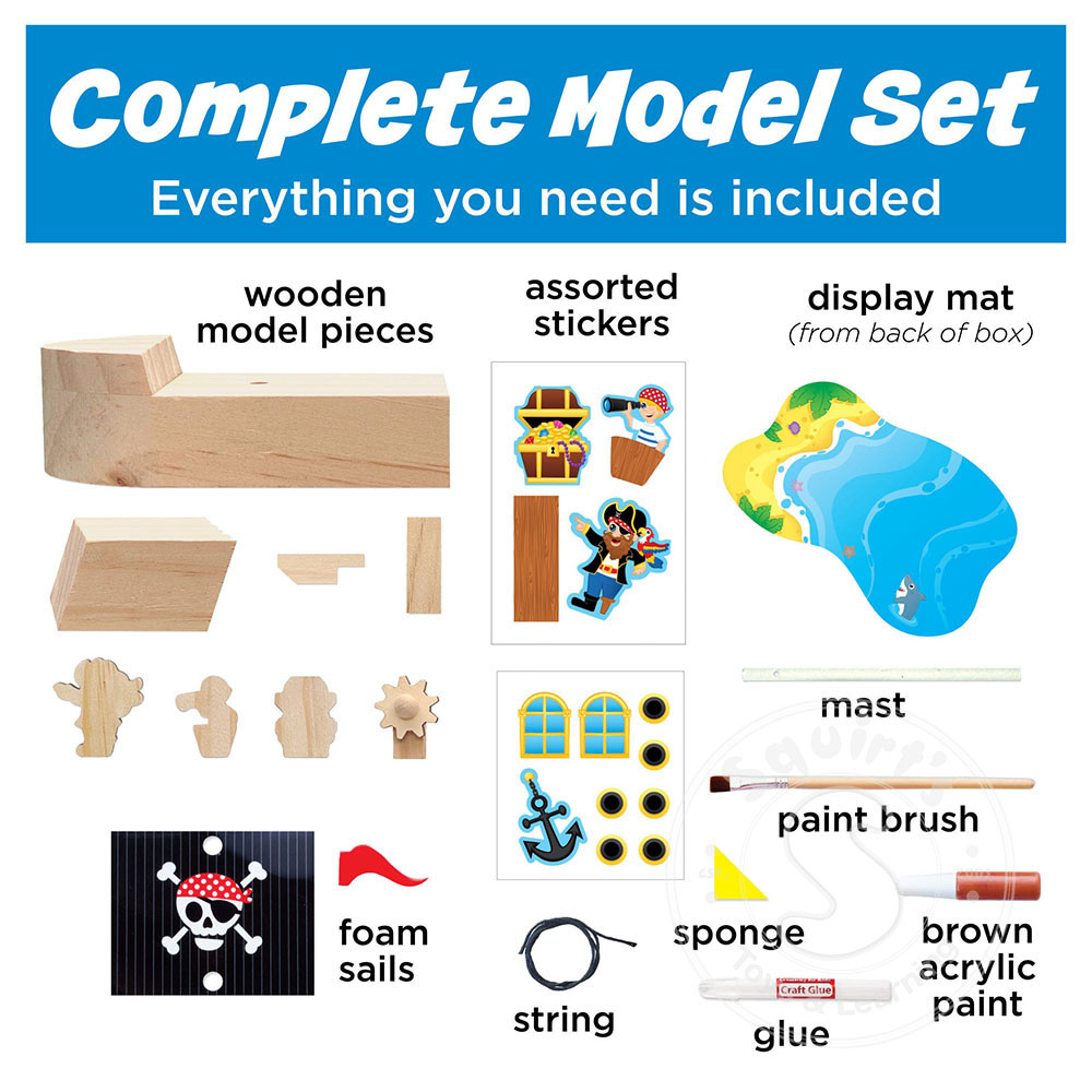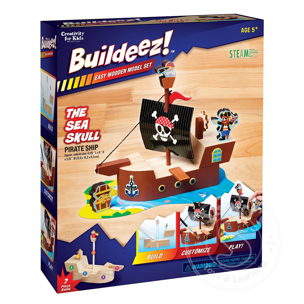 With this 7-piece miniature build, kids will construct, paint, sticker and play with The Sea Skull Pirate Ship! Featuring non-toxic paint, dimensional pirate ship stickers, a wooden treasure chest, pirate and more.