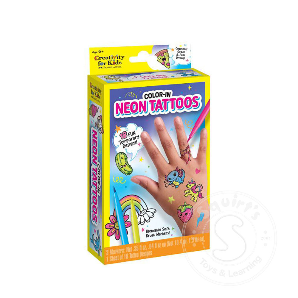 neon glow and holographic sheets. Complete temporary tattoo kit includes cosmetic grade, quick-dry components: 8 brush tip tattoo markers with 3 metallics for added sparkle. Fun for one or a small group!