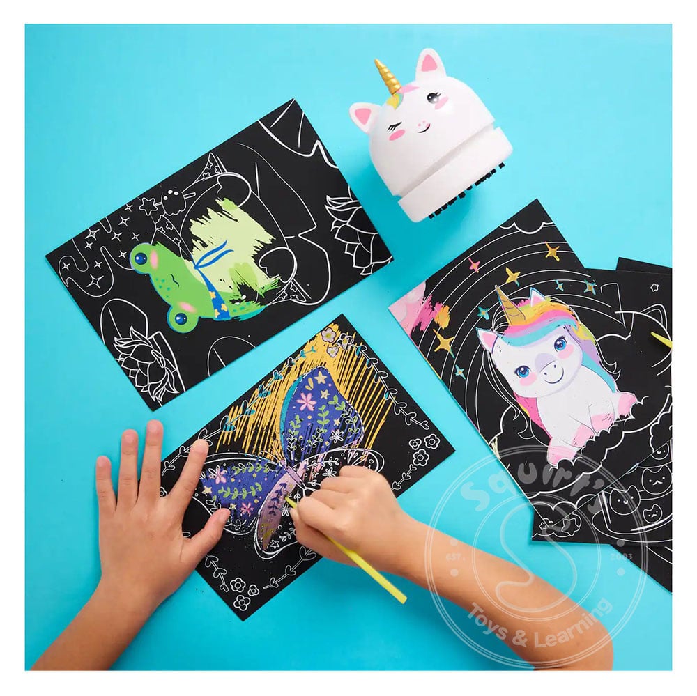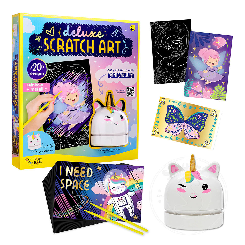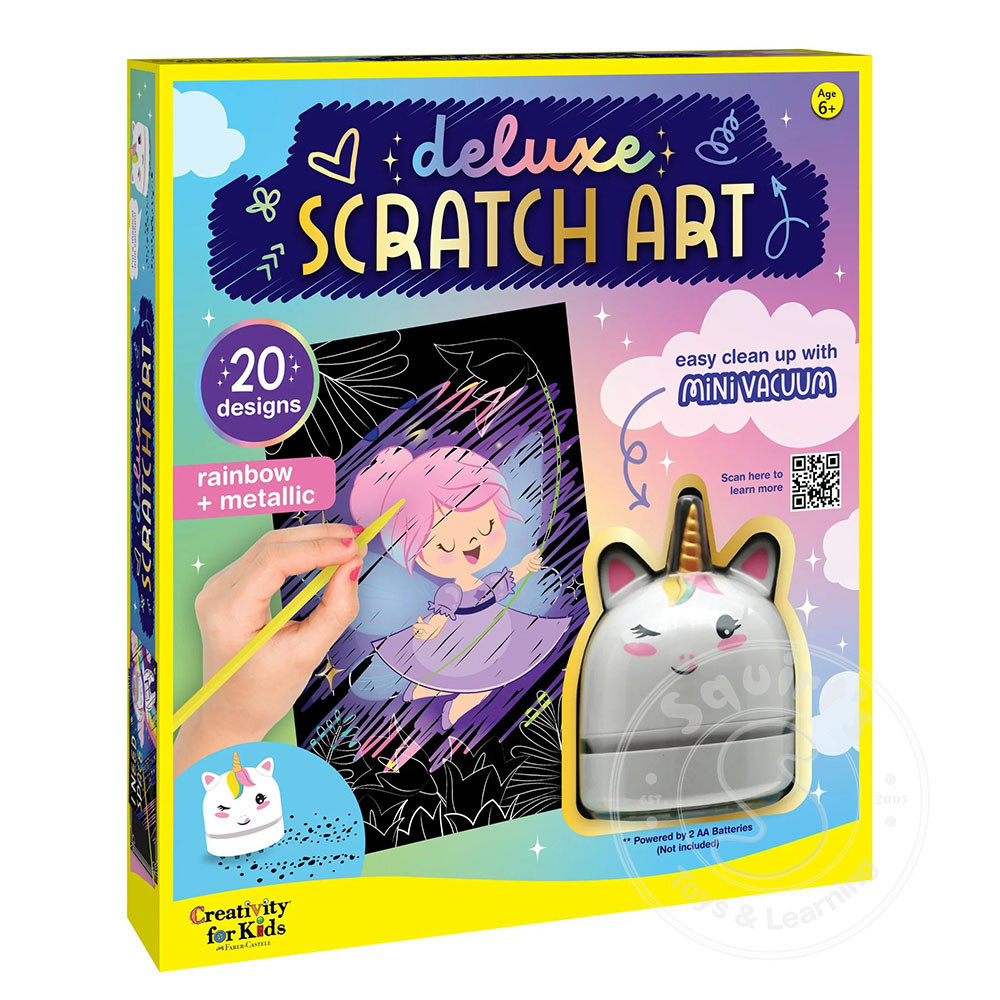 Watch hidden designs come to life with vibrant colors and fun characters with this deluxe scratch art kit. This kit features 20 hidden designs that you can scratch away with the included tools, then clean away in a breeze with the cutest unicorn...