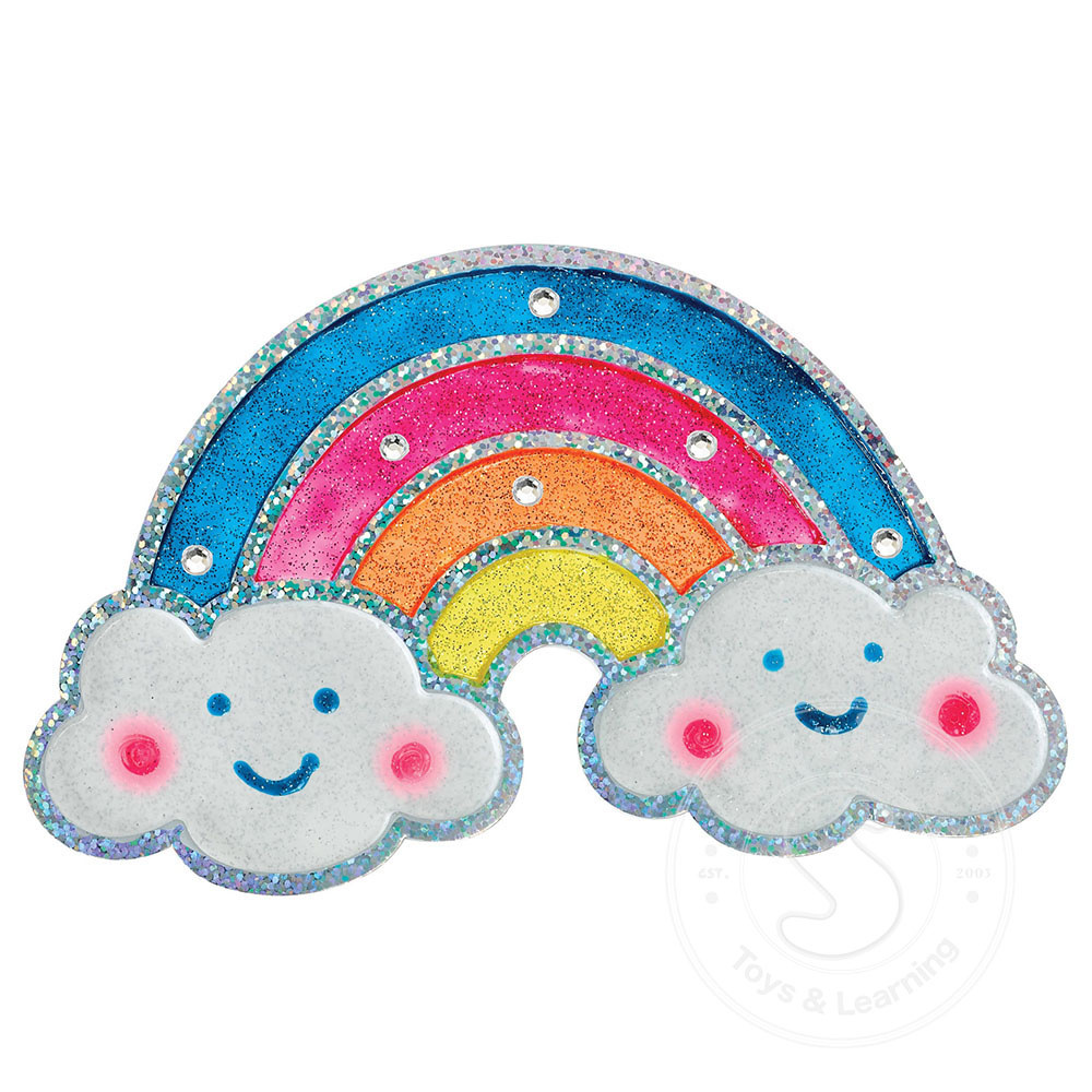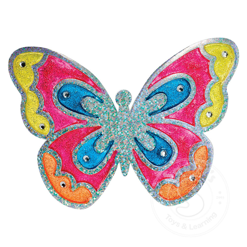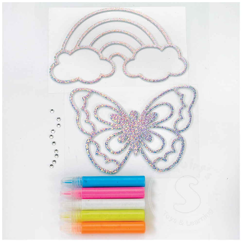 Contents Include: 5 glitter window paint colors, rhinestones, 2 EVA shapes (butterfly, rainbow), instructions