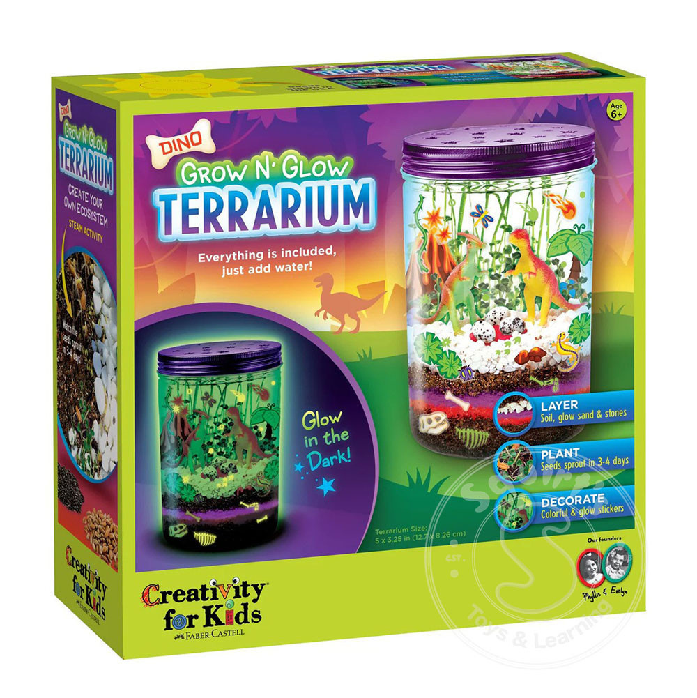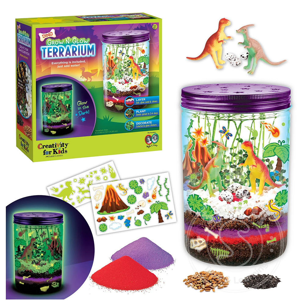 Discover the world of creativity, science, and nature with the Grow N Glow Dino Terrarium! This prehistoric-themed science exploration kit allows kids to craft, plant, water and grow their own ecosystem. Everything a young scientist needs to grow an...