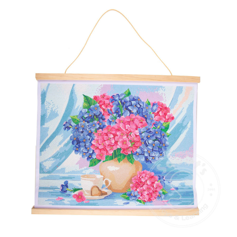 Crystal Art Scroll Kit: Happy Hydrangeas sit in a vase with their captivating purple and pink colours. It's makes taking a tea and biscuit break so much the better...