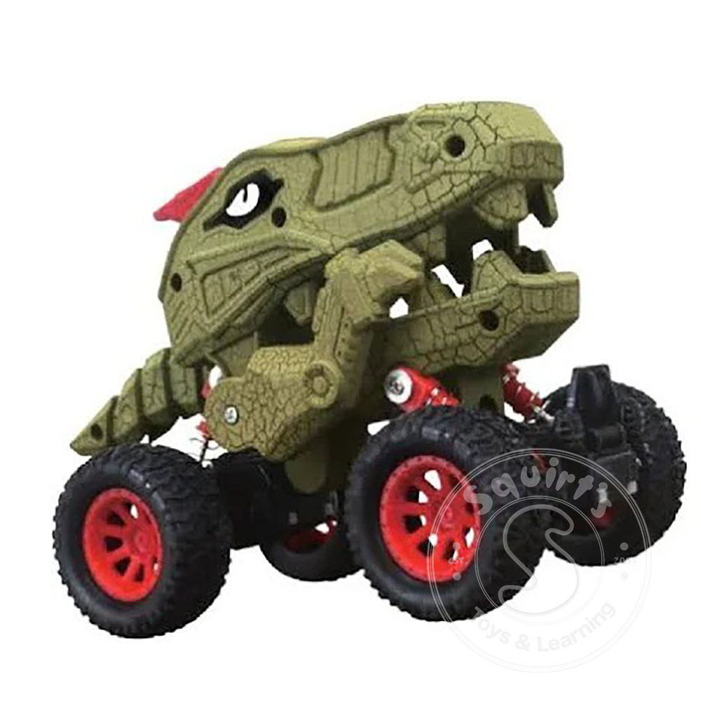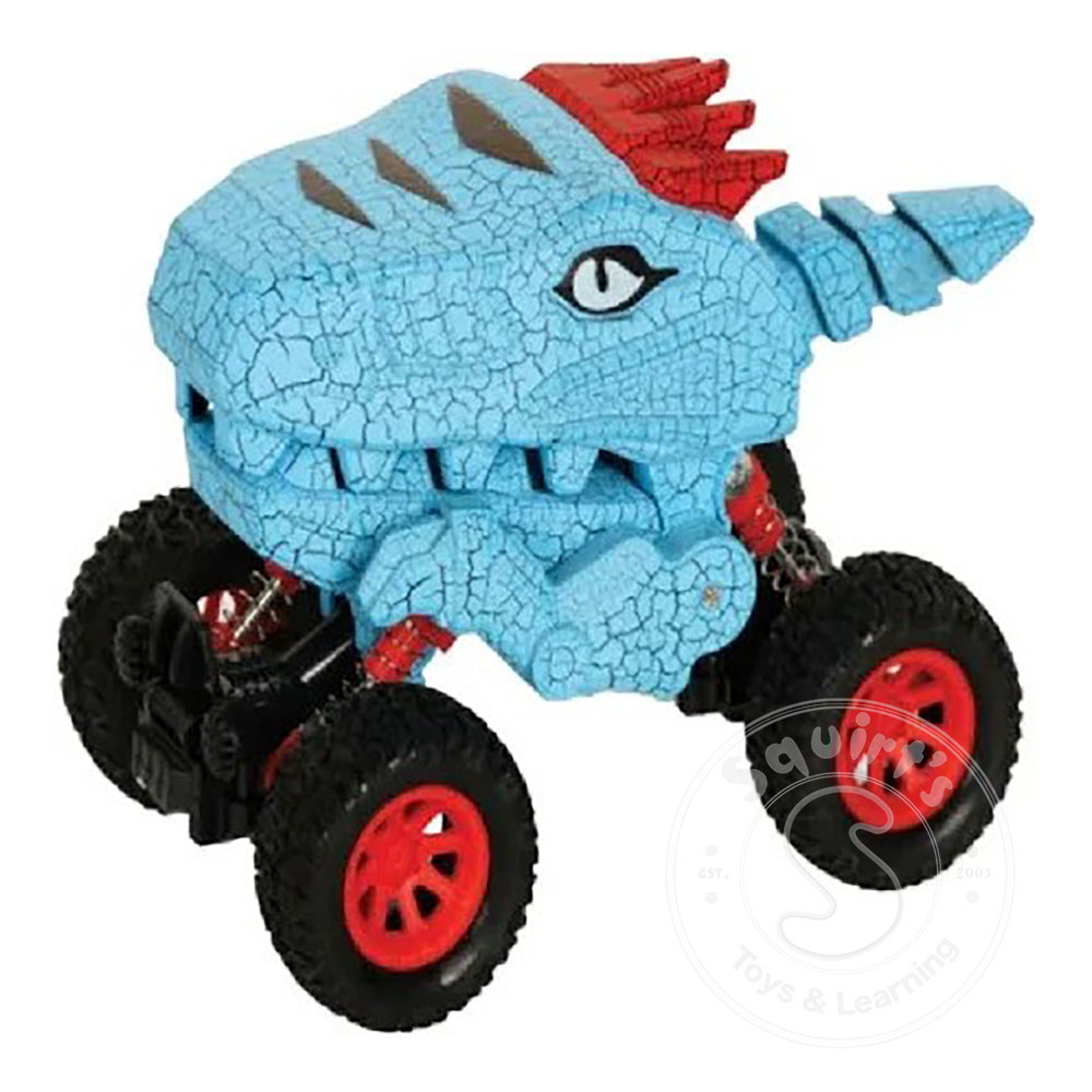 INCLUDES one dinosaur truck with amazing pull back action. Works on carpet too. Size: 7" L x 4. 5" H x 4"w. MOVEABLE mouth and tail, cool teeth, arms, and body detail gives this prehistoric truck a realistic feel. It can also do wheelies for added fun...