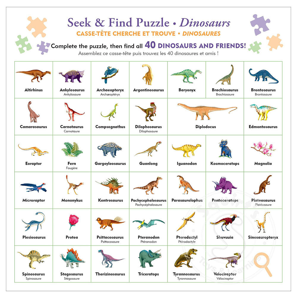 - Put the puzzle together, on your own or with the family. Then use the included picture guide to find the 40 dinosaurs and friends depicted around the puzzle border!