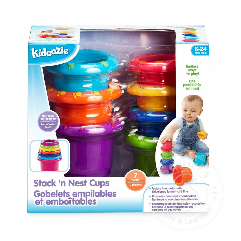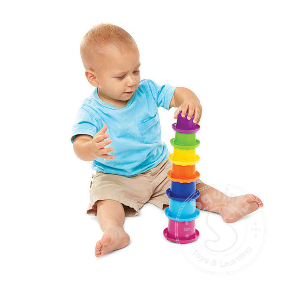 7 brightly colored cups are perfectly sized and shaped for easy stacking and nesting. Colorful raised shapes around the rim of each cup. Different shapes on the bottom of each cup. Stacks over 12 inches tall. Ages 6mos +