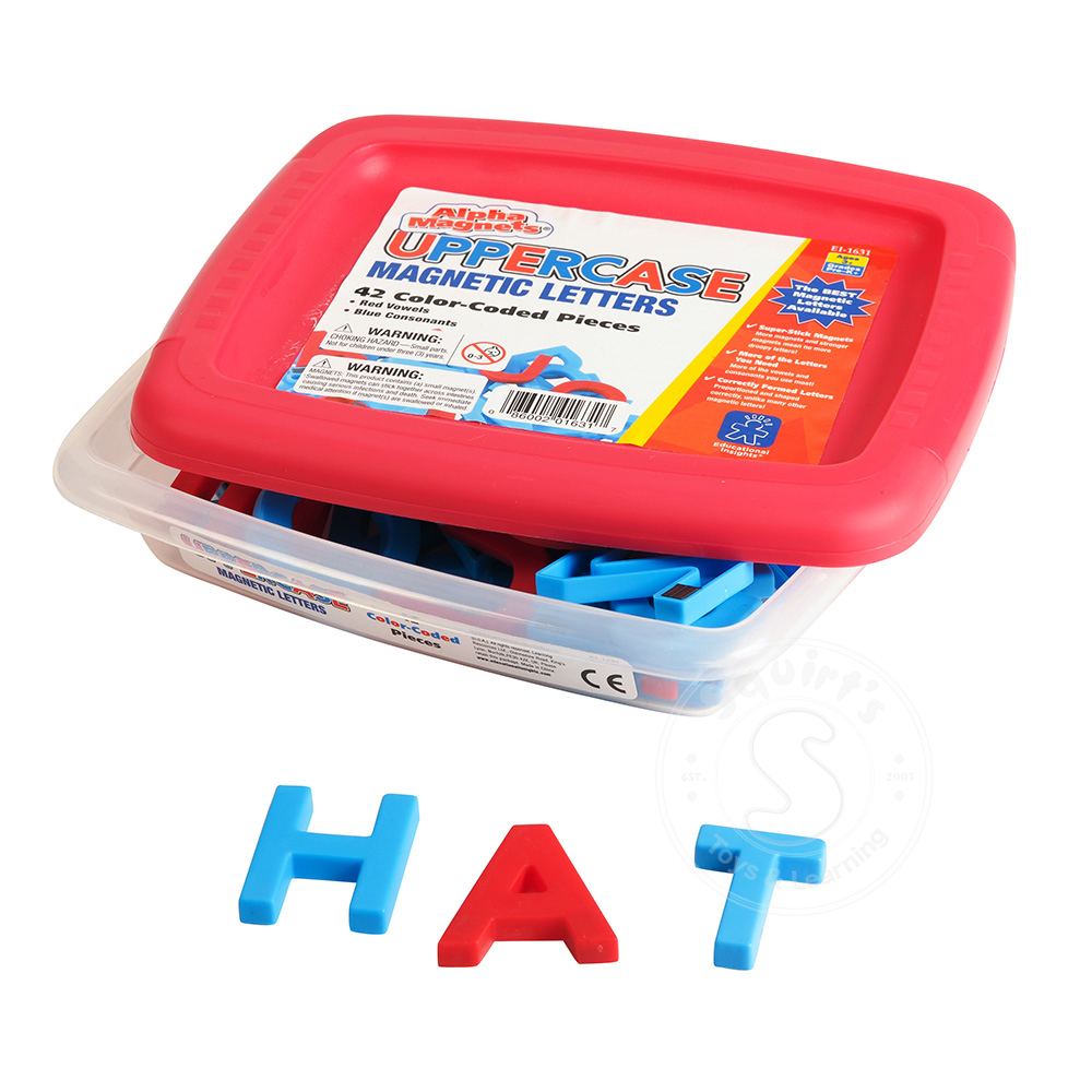 AlphaMagnets and MathMagnets are shaped accurately with correct proportions, and are made with strong magnets for a 'sure stick.' These pieces are 1-1/2” tall for handling ease and tactile feedback for young children learning basic skills. Alphabet assortments come with more of the letters you need most (extra vowels a, e, i, o, u, and consonants b, l, m, r, s, and t), and include punctuation marks. Color-coded sets help teach differentiation with red vowels and blue consonants (42 pieces). Comes in a durable, stackable tub with brightly colored plastic lid for convenient self-storage. Ages 4-7