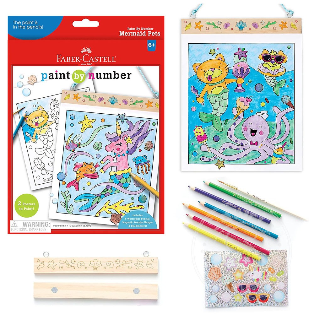 DetailsCreate two mermaid pets themed pictures with this 2-in-1 activity featuring Faber-Castell Watercolor Pencils. With the Paint by Number Mermaid Pets Wall Art Kit, kids will have hours of creative fun as they experience the joy of coloring and...