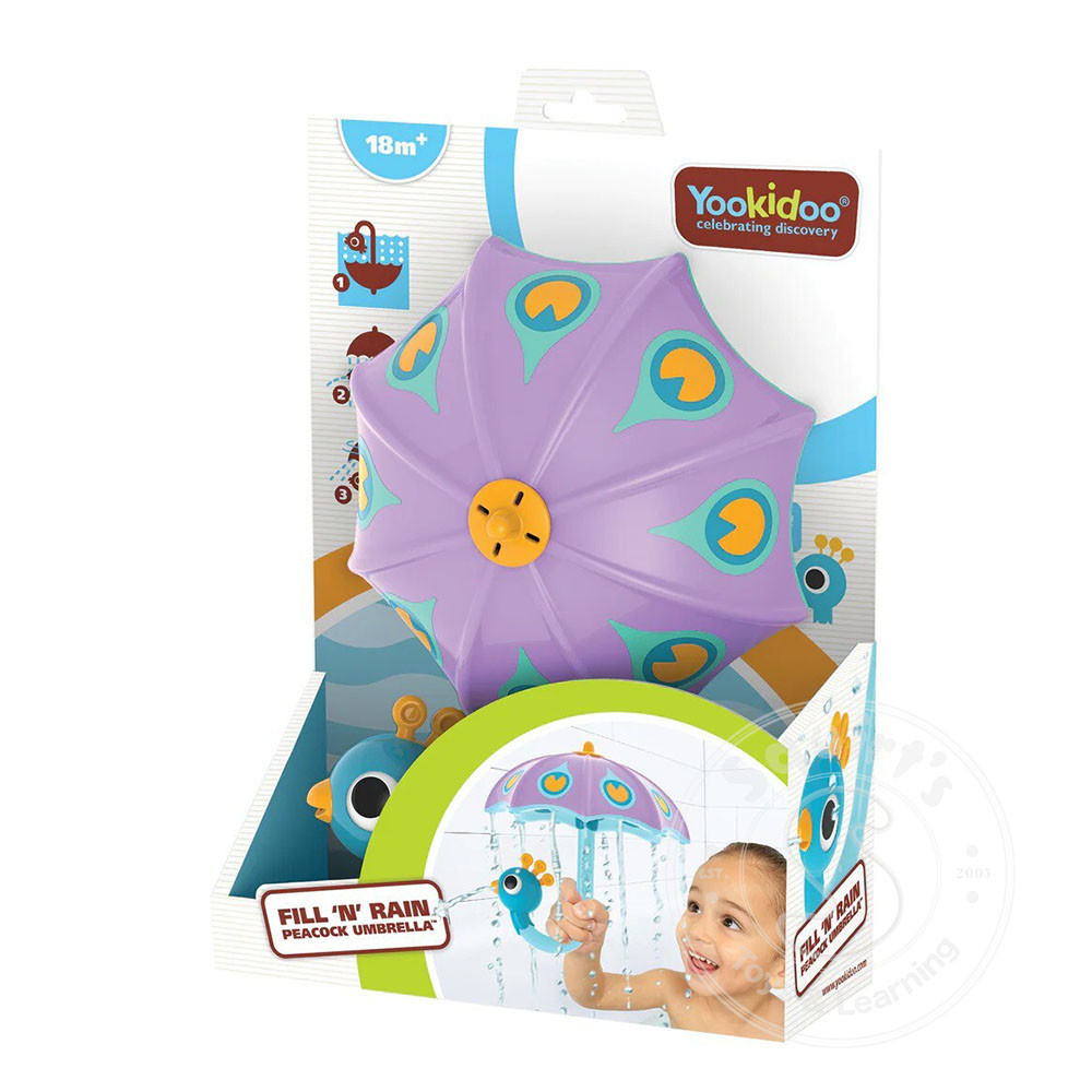 Submerge the peacock umbrella upside-down, letting it fill with water as bubbles come out. Raise the umbrella and turn it upright, then watch as water sprinkles from the peacock's mouth and the umbrella gently pours rain. The peacock umbrella...
