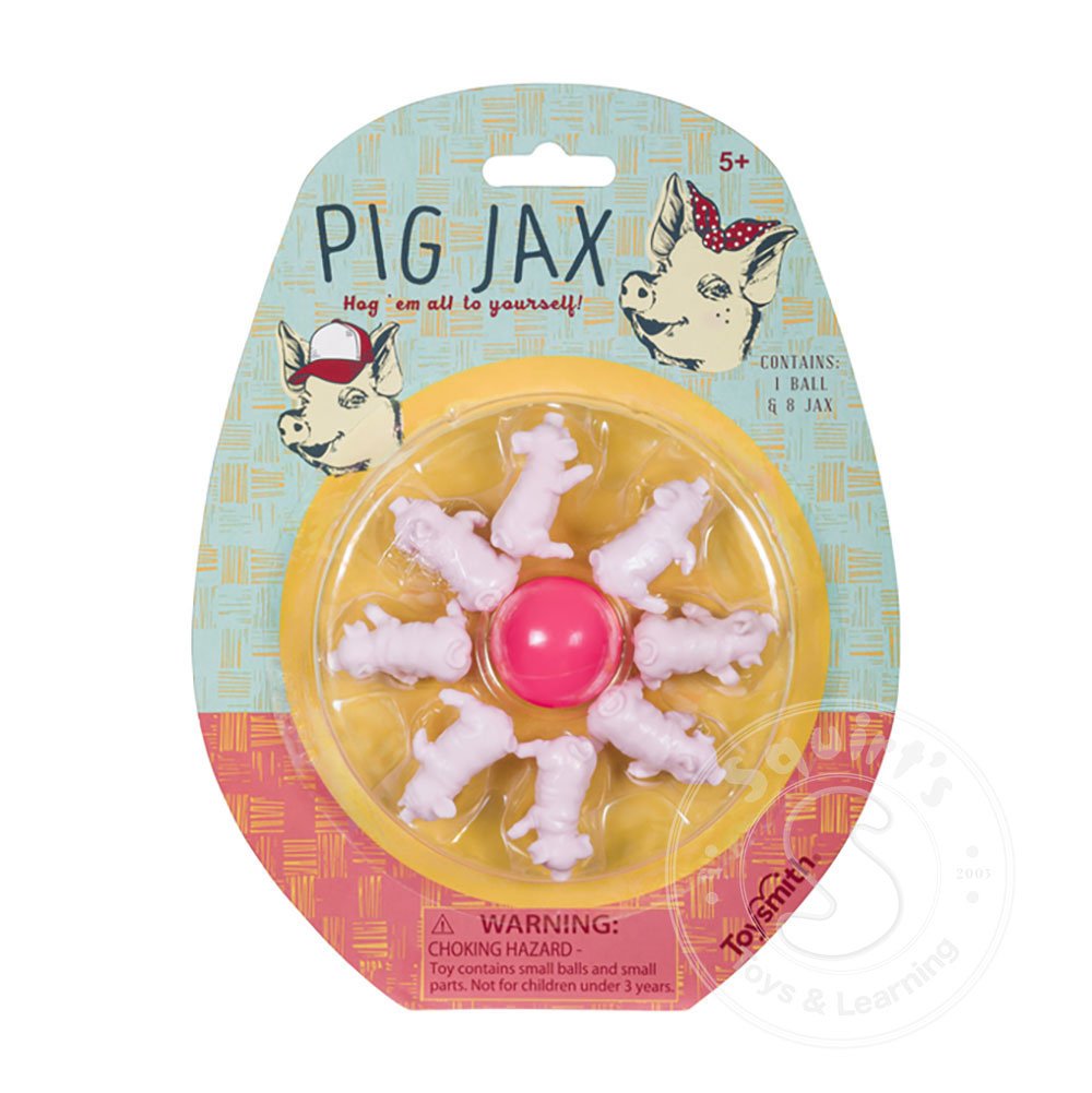 Pig Jax is a refresh of the classic game that includes 1 bouncy ball and 8 piglet jacks inside a peggable blister packet. Each piglet is intricately designed with realistic piggy features and a light pink color. Suitable for indoor or outdoor play on ...
