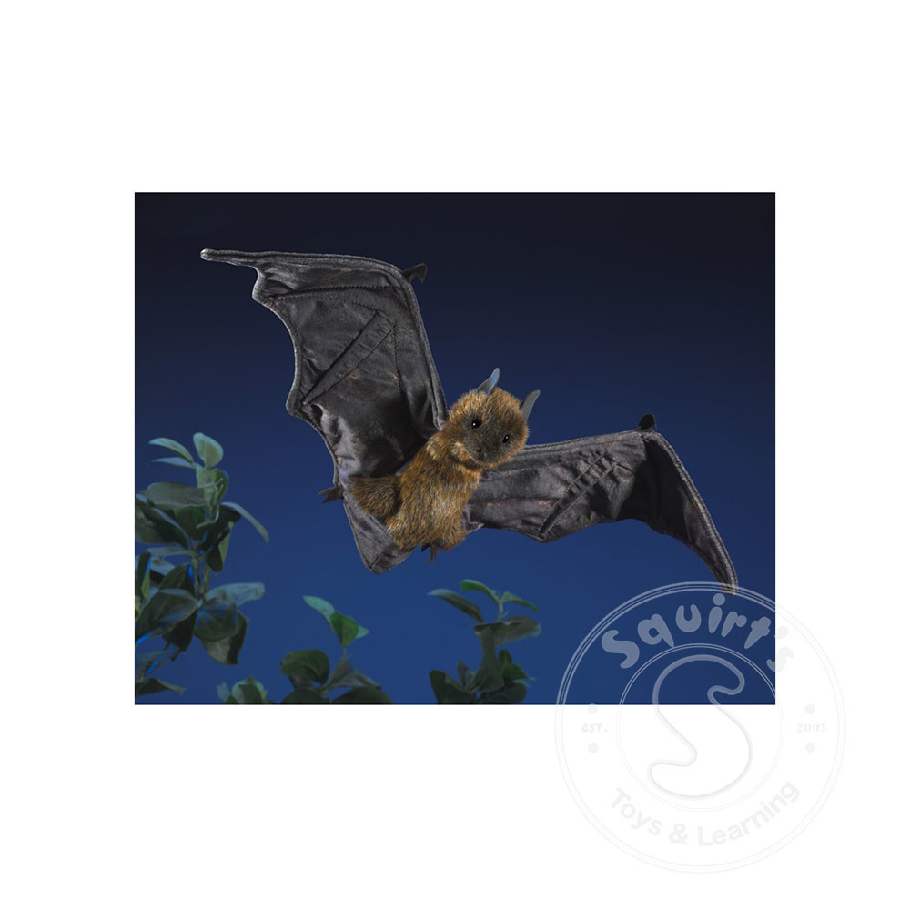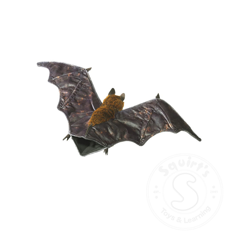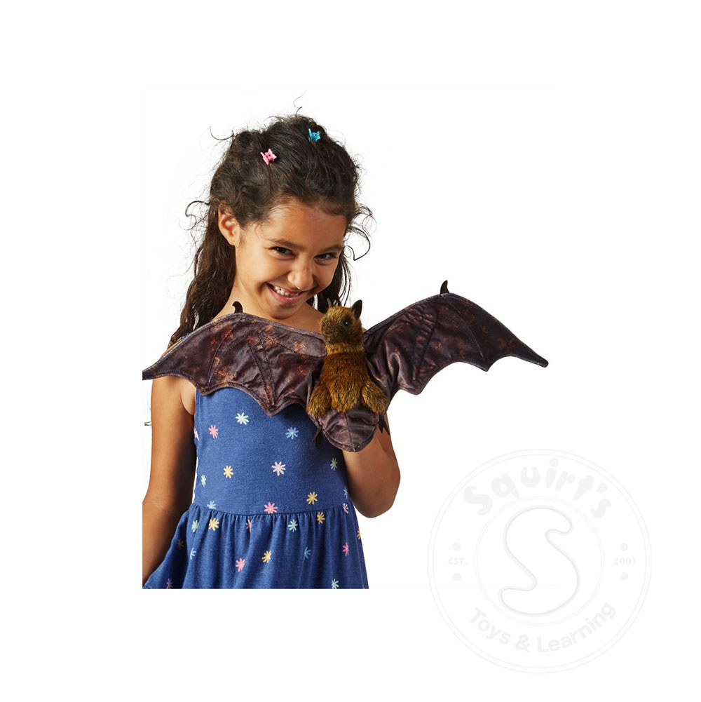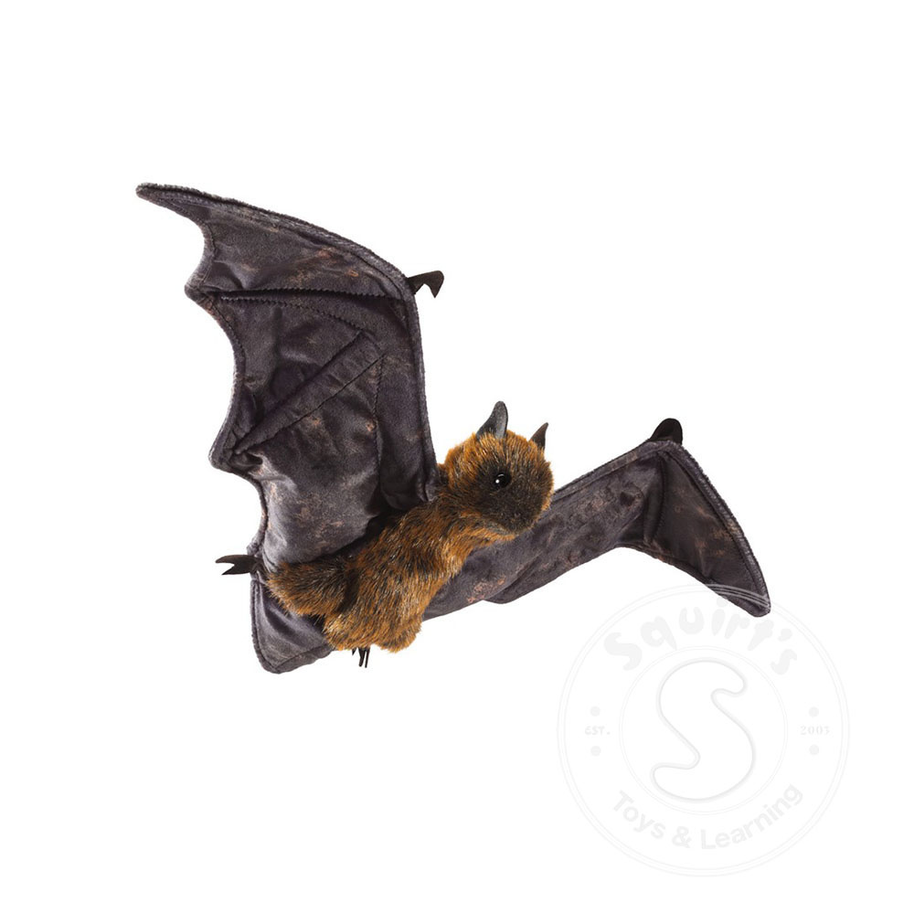 Flying in for friendly fun is the Folkmanis Fruit Bat. Also known as a flying fox, this winged wonder has a cute, foxlike face with short snout and pointy ears as well as movable wings that span 20" . Size: 9" tall, 3" long