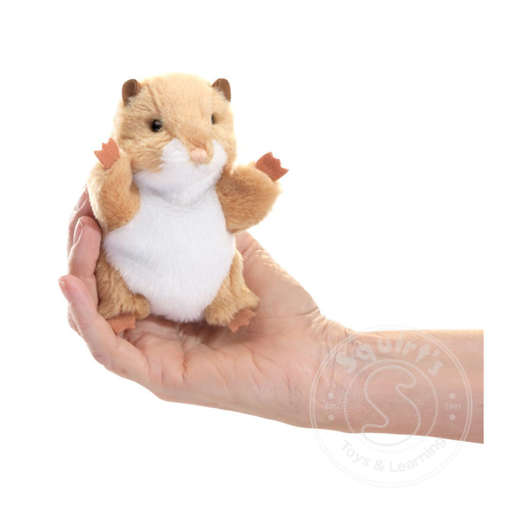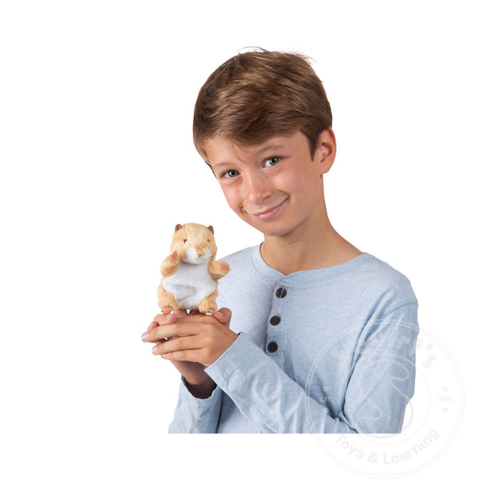 Soft and sweet, the Mini Hamster puppet is a perfect pocket pet that comes alive with three fingers in the head and forelegs (Movable head and forelegs). Length:3" Long; Width: 3" Wide; Height: 4" Tall