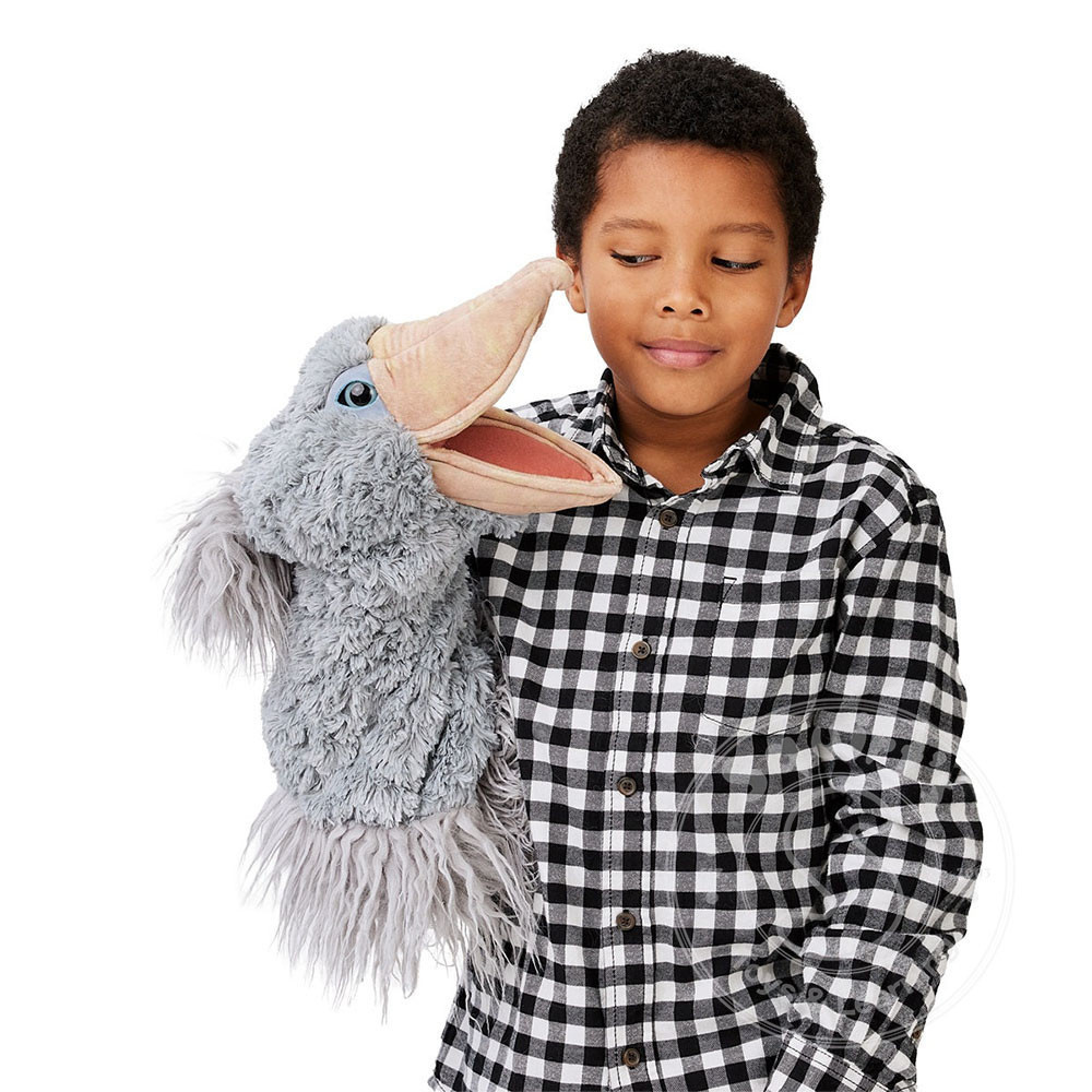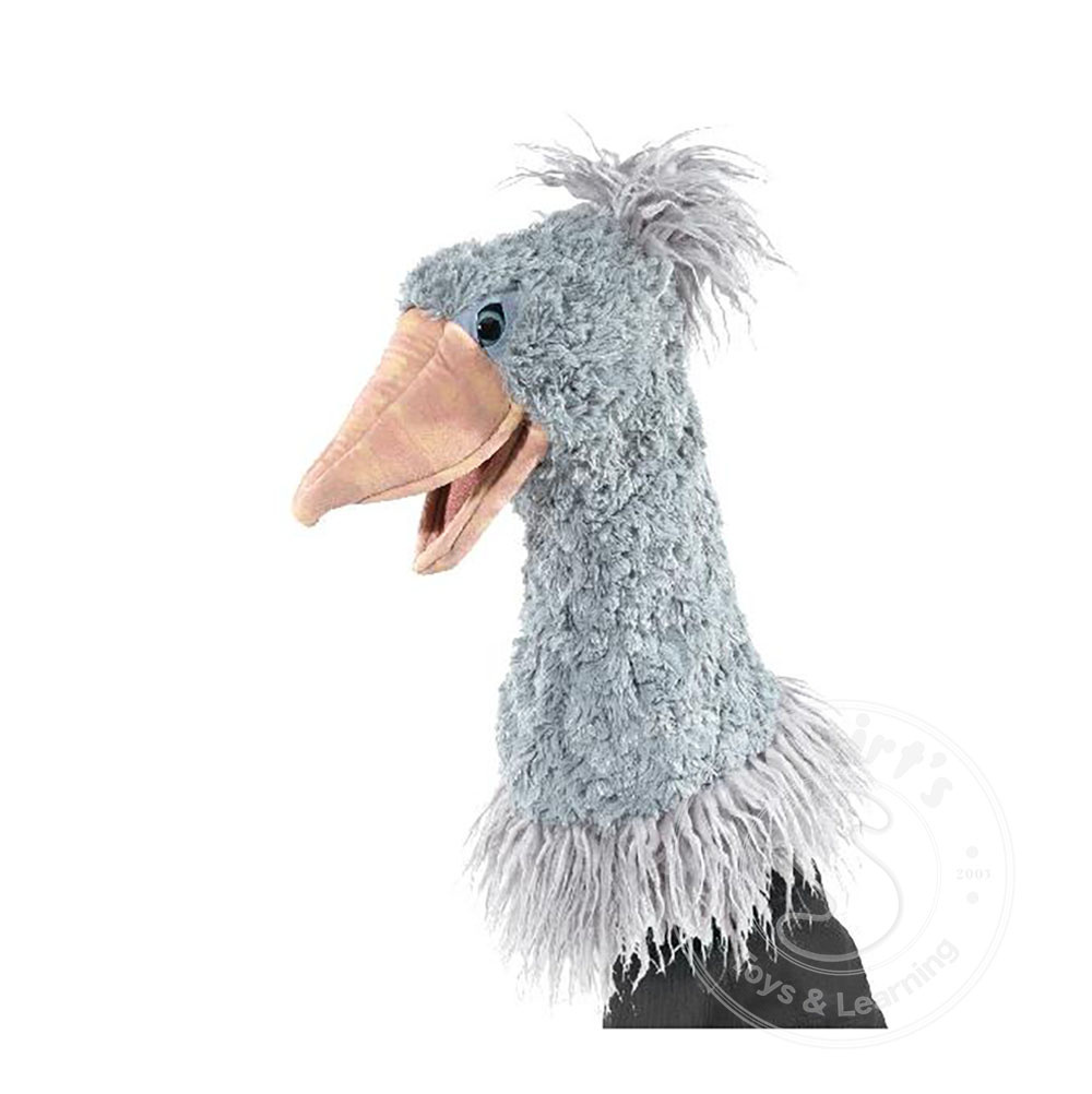 An Old World prehistoric looking bird rumored to be related to dinosaurs, the massive Shoebill makes a clattering sound. The Folkmanis Shoebill stage puppet is designed in a cool gray-blue palette of feathery plush. Expressive eyes and a hidden...