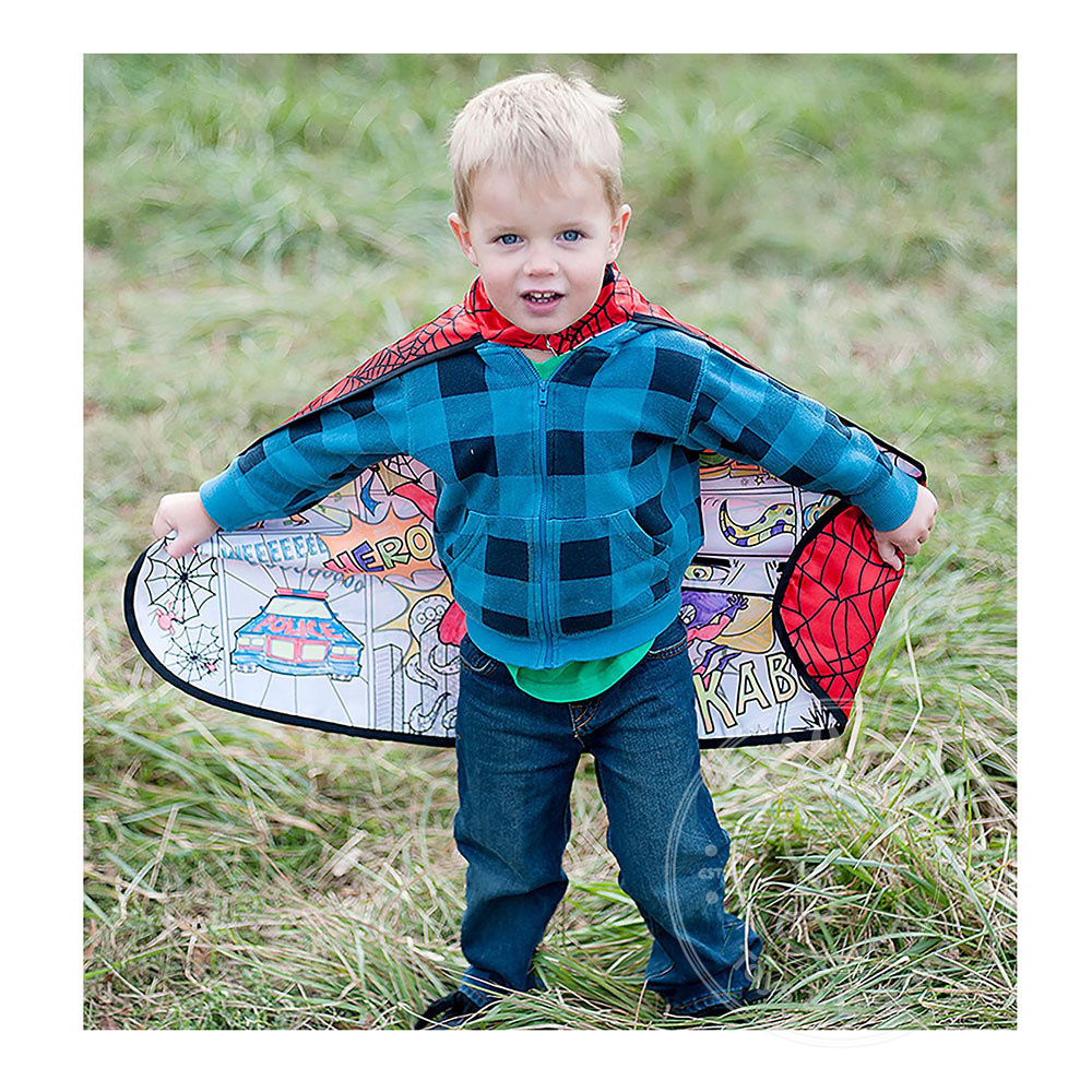superhero can colour, wash it, and colour it again. This cape is also reversible with a red spider printed satin on the other side.