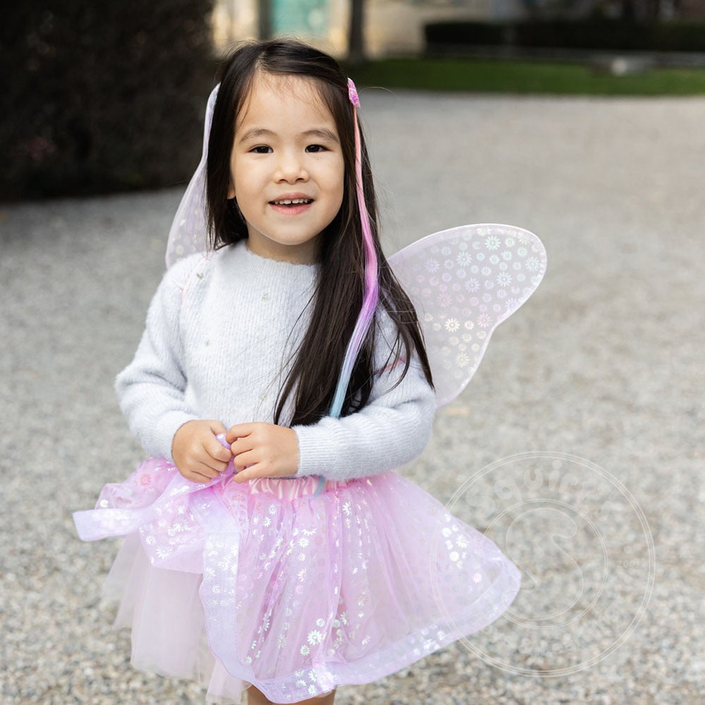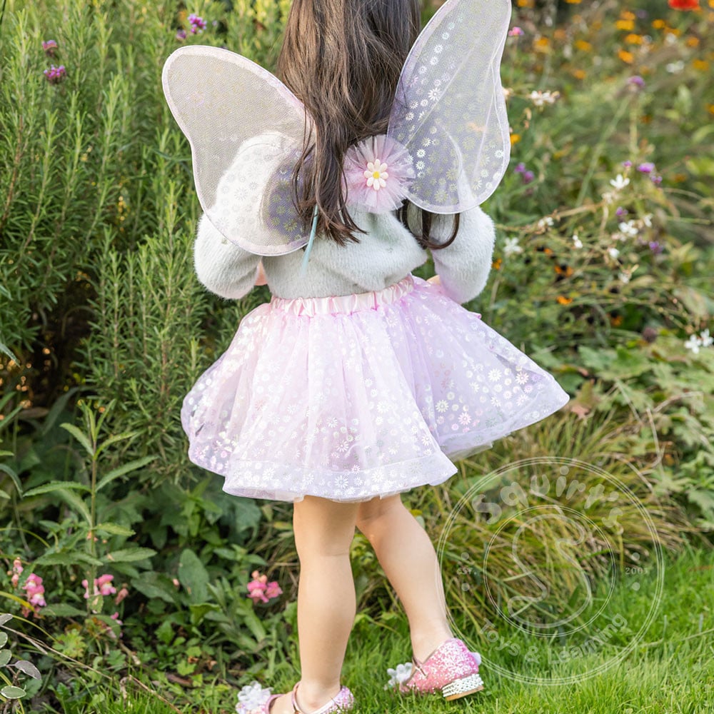 The fluffy pink tutu is covered in iridescent daisy details that shimmer and dance with each spin. Matching butterfly-shaped wings are sheer, sparkly, and feature the same enchanting daisies including one special bloom right where the wings meet in the centre, like a magical garden moment.