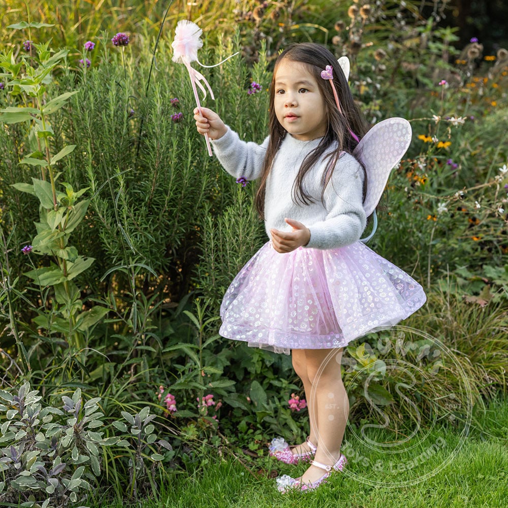 To complete the fairy-tale transformation, the set includes a pink wand topped with a daisy to match the wings perfect for casting smiles, sunshine, and sweet wishes.