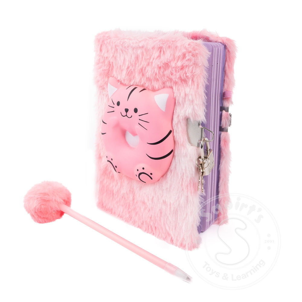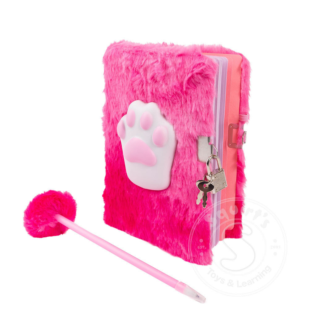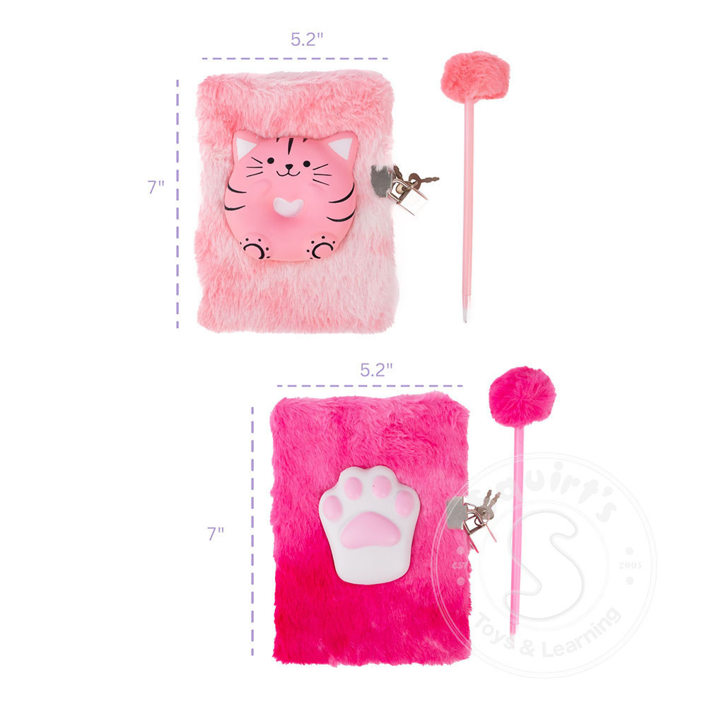 the cover, perfect for stress relieving squeezes between writing bursts! The hot pink journal comes with an oversized squishy cat paw.Both covers are irresistibly soft to the touch, with playful textures that make them as fun to hold as they are to use. Both journals are delightfully fuzzy to hold and come with a lock and key, so every secret, story, and doodle stays safely tucked away. Plus, each journal includes a matching pen topped with a fluffy pom-pom for extra flair and fun!