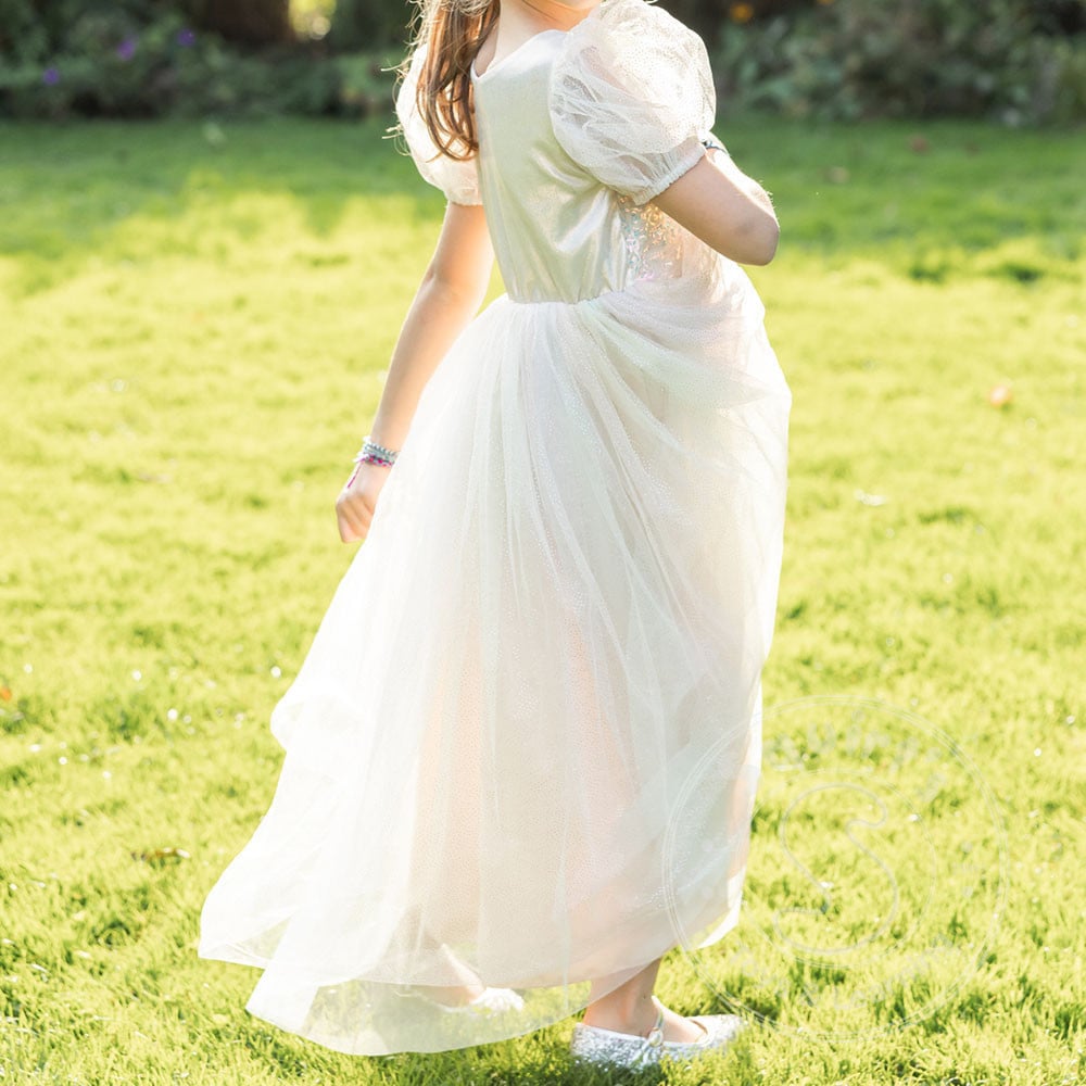 The skirt matches the sleeves in soft pink, and beneath it hides a dreamy surprise — layers of rainbow tulle that peek through with every step, swirl, and spin. It’s a subtle rainbow moment that feels like sunshine and sherbet swirls!