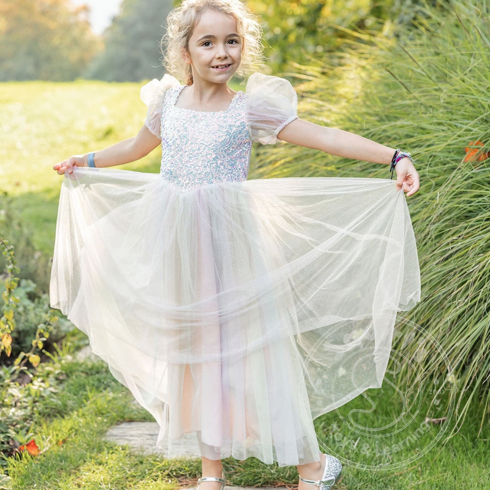 Add a scoop of magic to every twirl with our Rainbow Sherbet Sparkle Dress! The bodice shines with large iridescent sequins, while sheer pink puff sleeves sprinkled with tiny sparkles bring extra sweetness to the look...