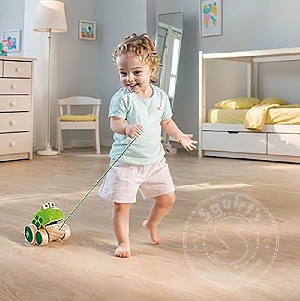 - The frog-themed pull toy is great for encouraging children to crawl and a great companion when they start to walk or run around the house