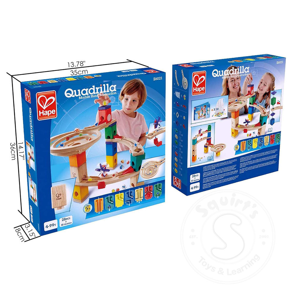 marble run. Every Quadrilla marble run is different and provides a combination of a great mix of spins, drops, seesaws, and speed that will have marbles going every which way! As with every Hape Quadrilla Marble Run Construction Sets, it combines easily with other Hape Quadrilla products for expansion and unique combinations that will enhance your child's play experience.
