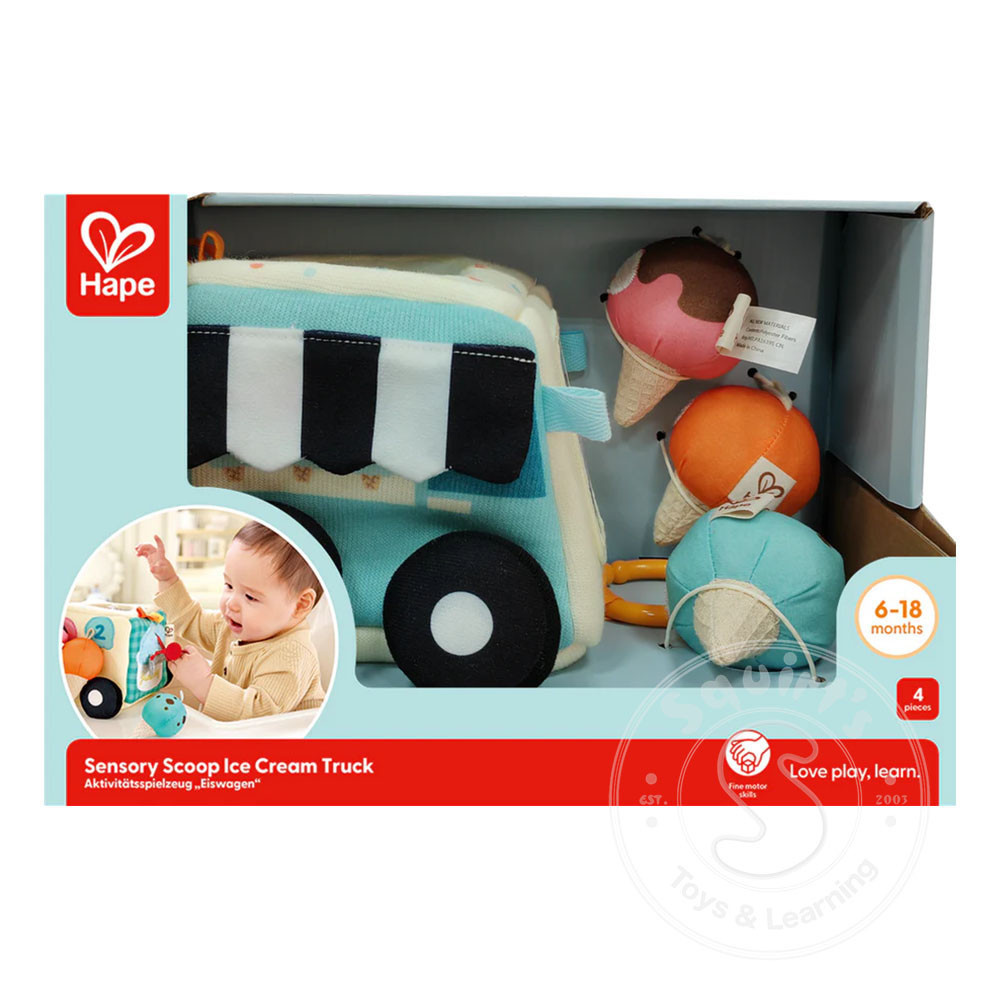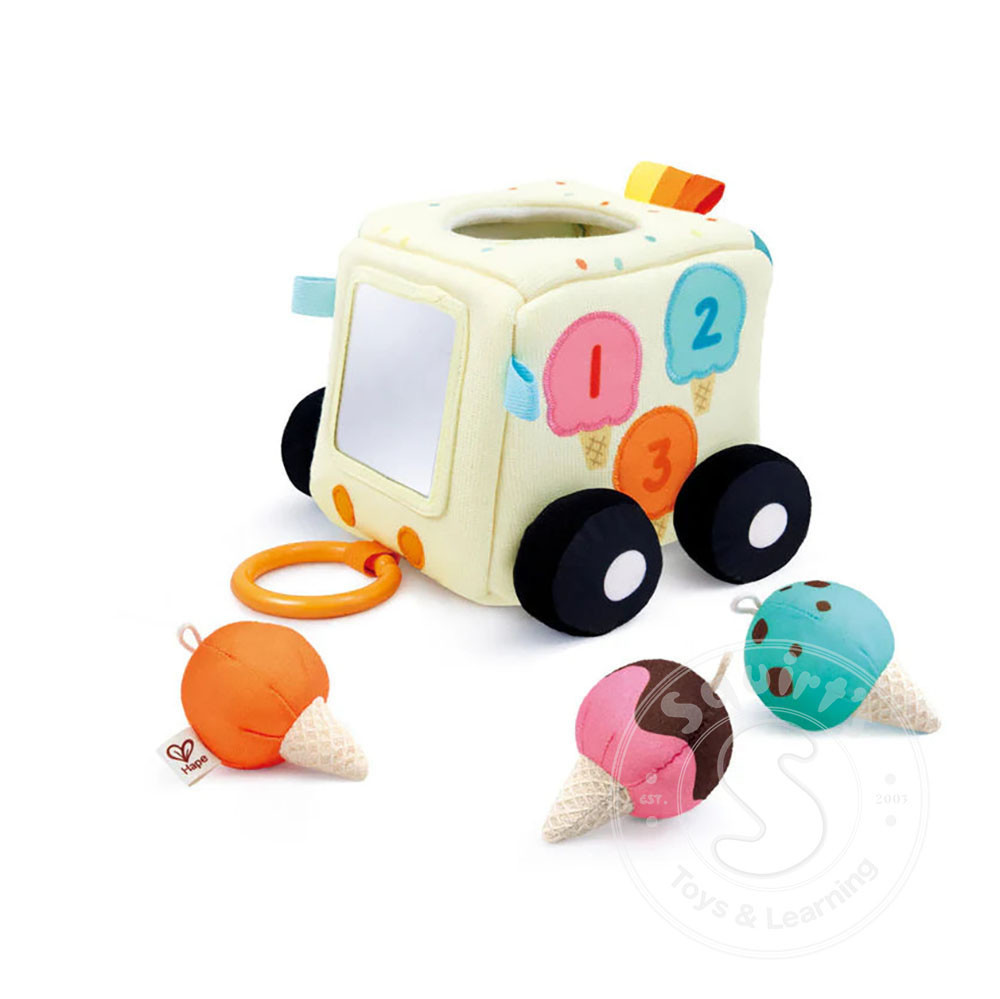 This soft plush sensory toy is inspired by a playful ice cream truck theme, featuring a mirror, crinkly textures, and rattling elements to encourage tactile exploration and motor skill development. Its vibrant colours and fun details create an...