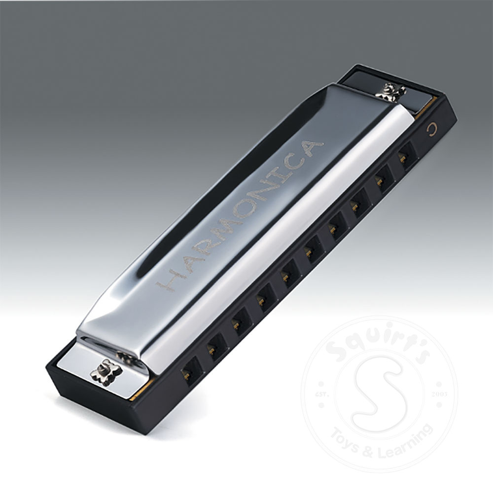 This harmonica is a 10-hole, Key of “C” and Grades PreK+ model. It is 4.25” long.