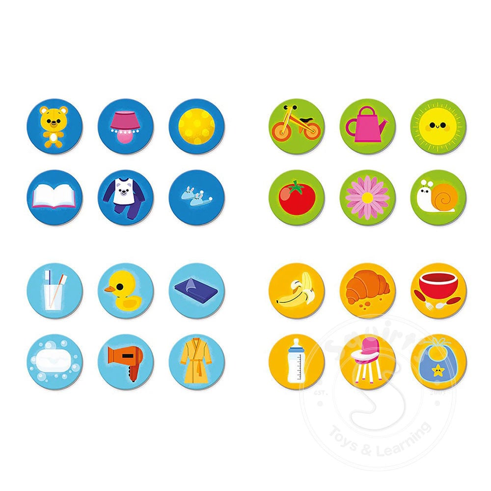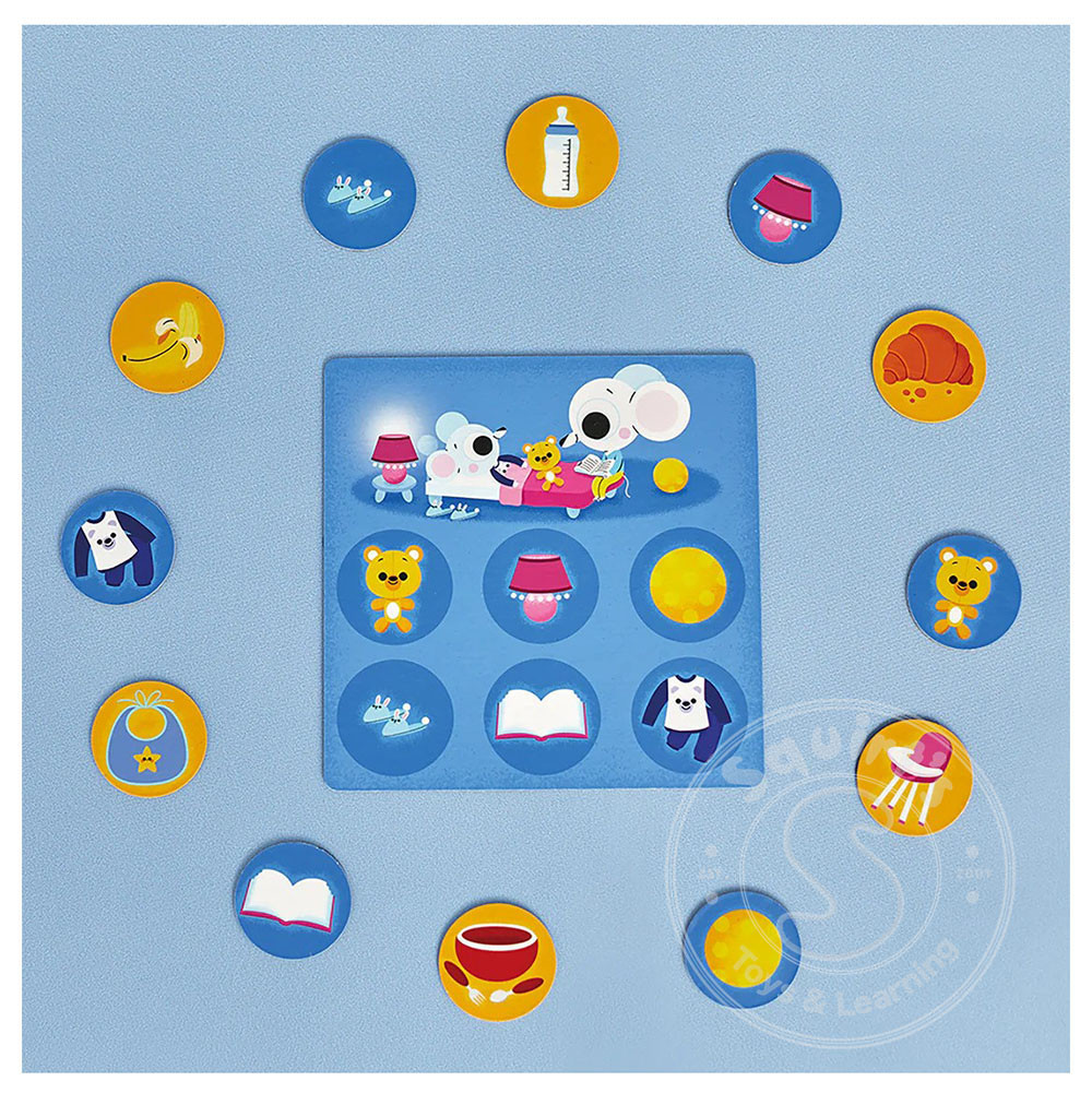 illustrated tokens on the corresponding elements in each room, thereby stimulating their observation, vocabulary, and memory. The large pieces are suitable for small hands, allowing 1 to 4 players to join in.