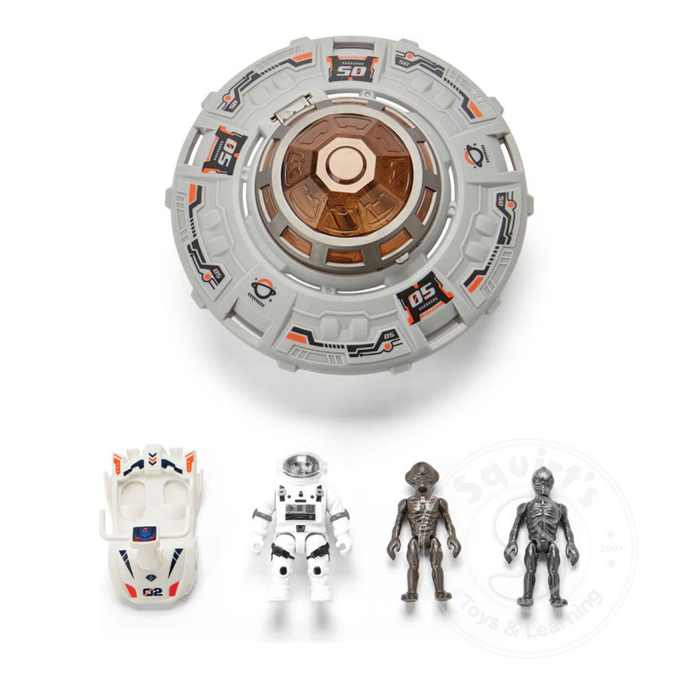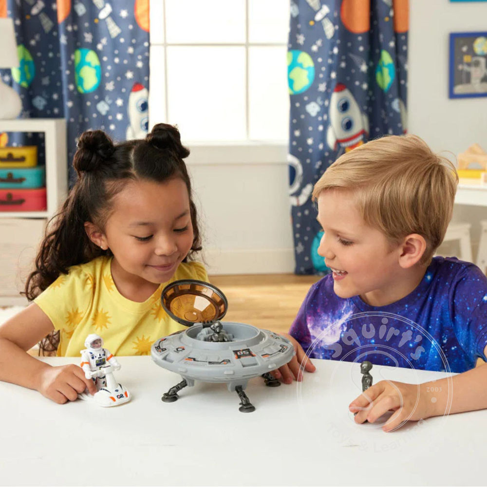 Includes: a UFO with an opening capsule and fold-down landing gear, 2 colorful aliens, 1 astronaut figure, and 1 space sled.
