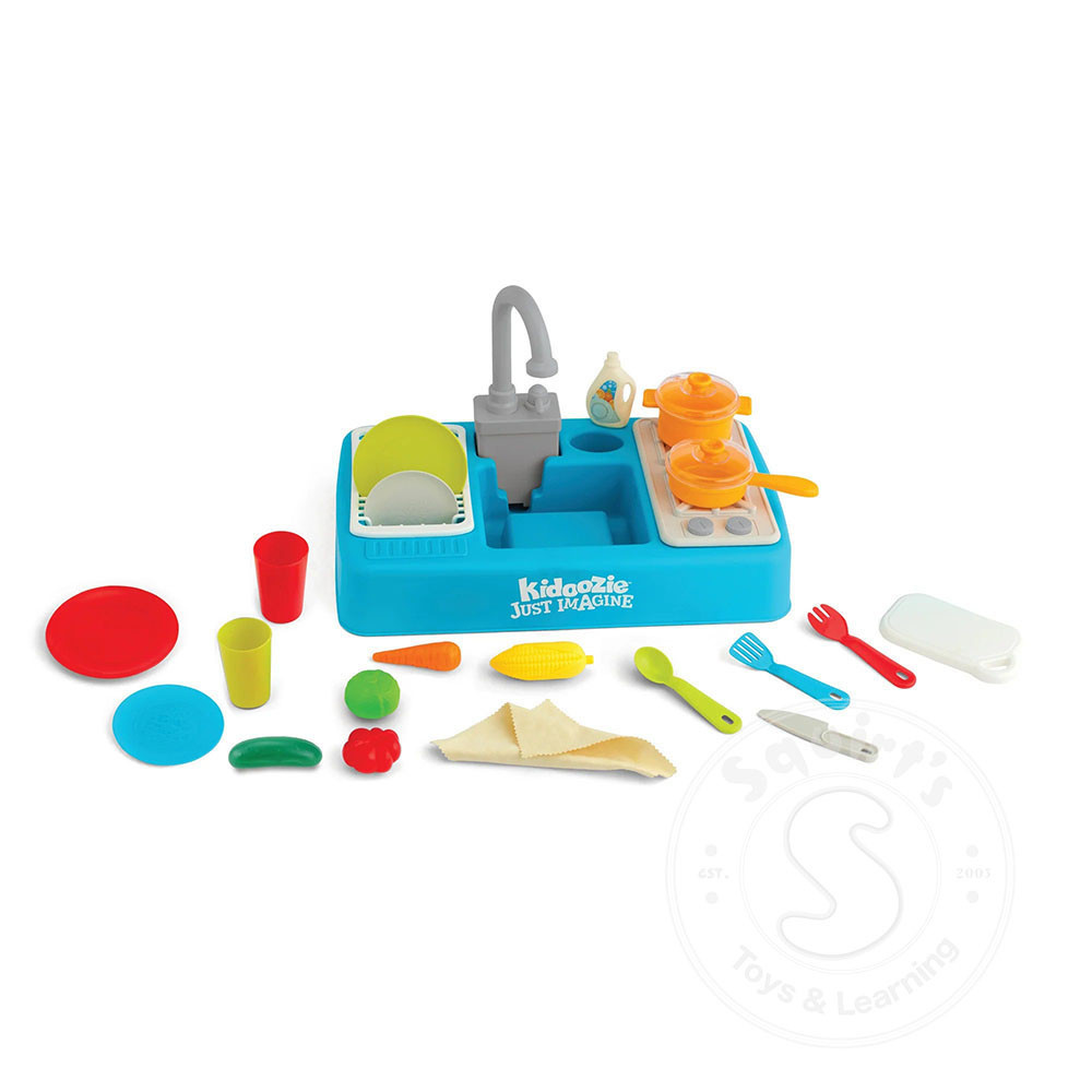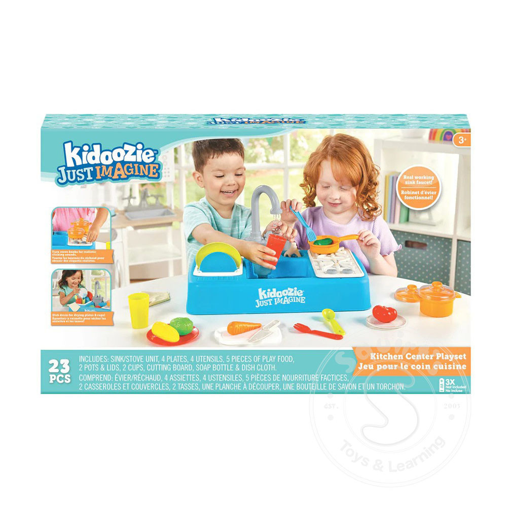 Spark your little chef's imagination with the Kidoozie Just Imagine Kitchen Center Play Set! This 23-piece playtime paradise features a working water faucet, dish drain, and twistable stove knobs for realistic cooking adventures. The set comes fully...