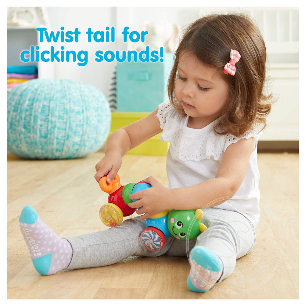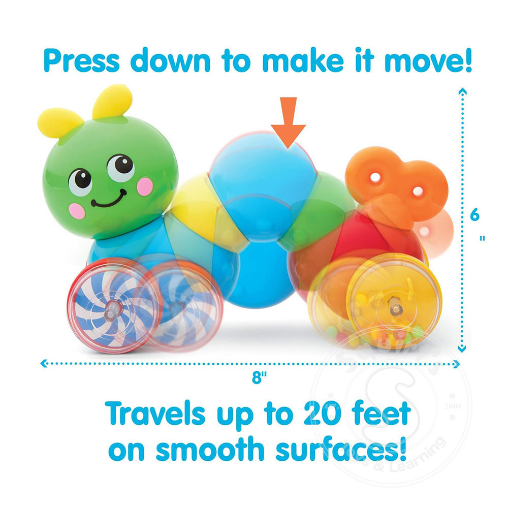 New version of a classic Kidoozie favorite! Press down on the inchworm’s back and watch him zoom across the floor. Head turns 360°. Features swirling wheels and tumbling beads.