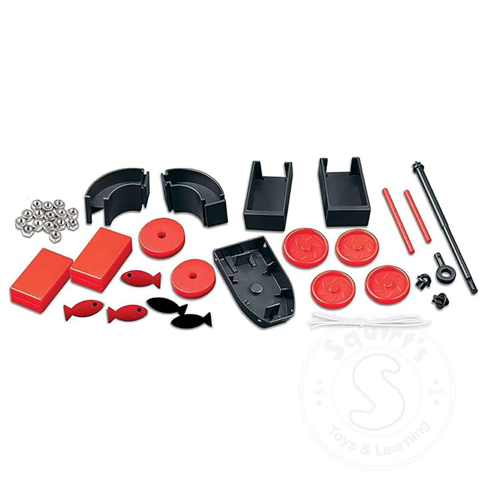 Transform the super magnet set to perform 10 fun experiments and games. Construct a super magnet racer, a compass yacht, a mysterious dangler. Play a fishing game, create a magnetic sculpture & more.
