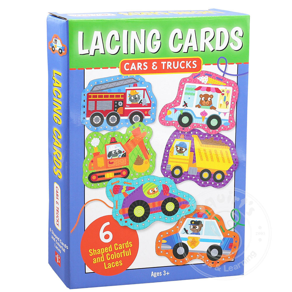Designed especially for little hands, lacing cards help develop eye-hand coordination, dexterity, and fine motor skills. They provide hours of fun, too! Our lacing kit comes with 6 cards featuring colorful cars and trucks, plus matching laces...