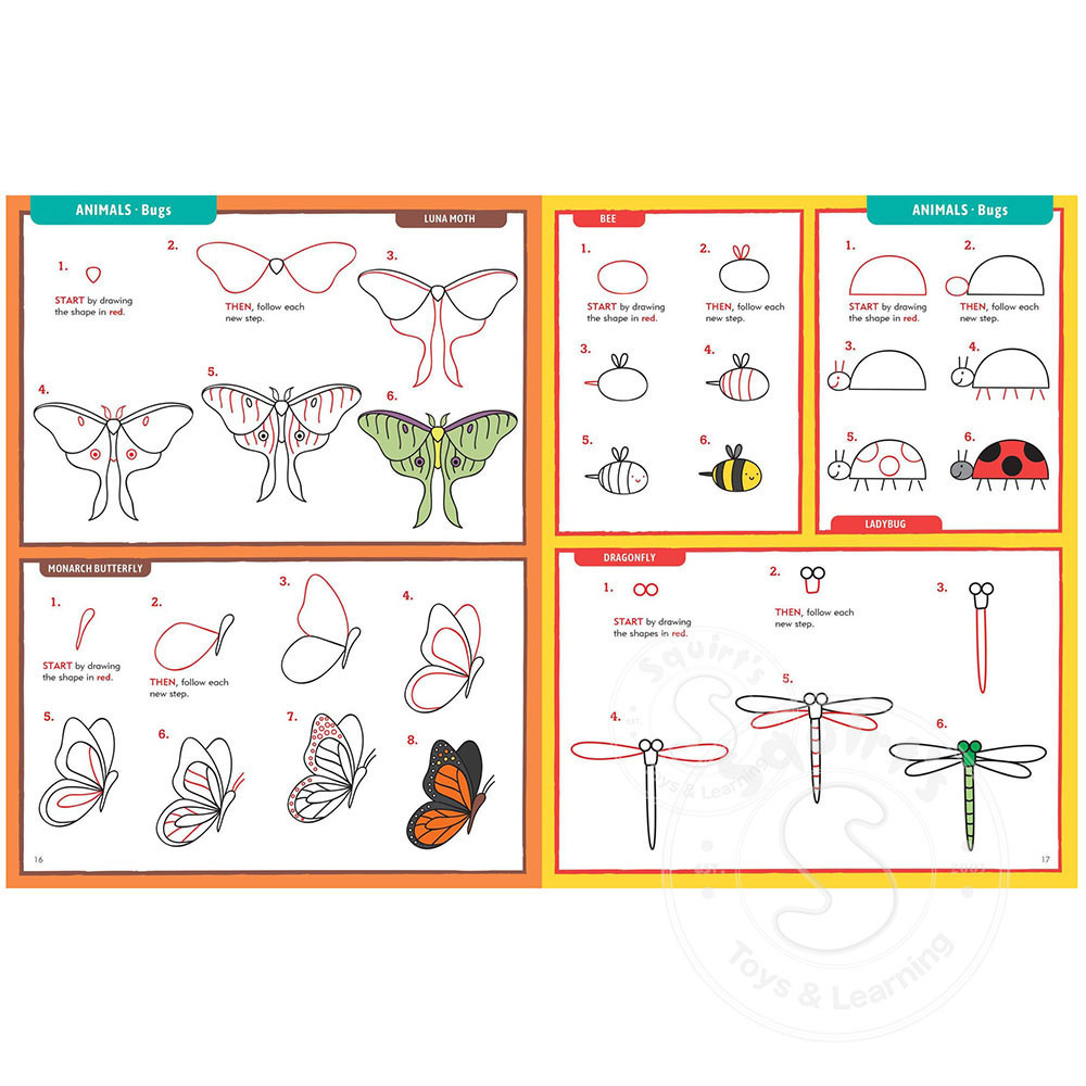 The red guiding lines in each step that make completing each drawing simple, easy, satisfying, and fun!