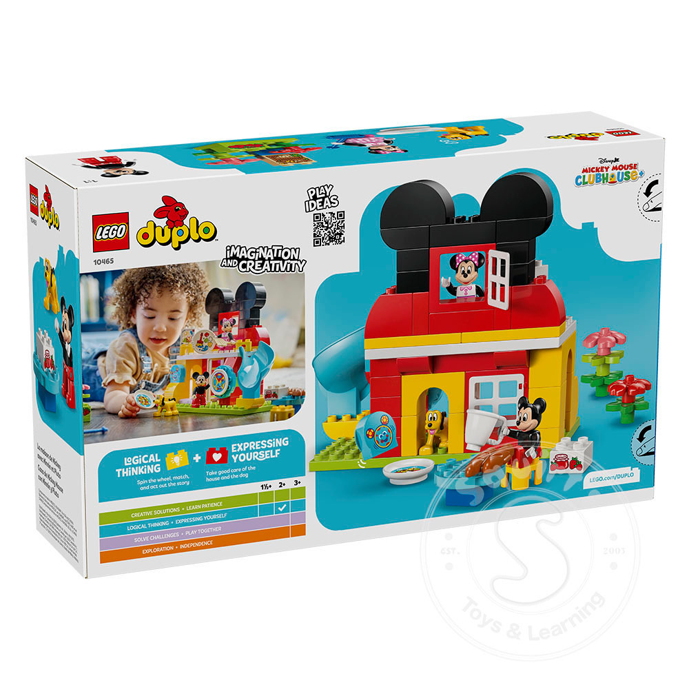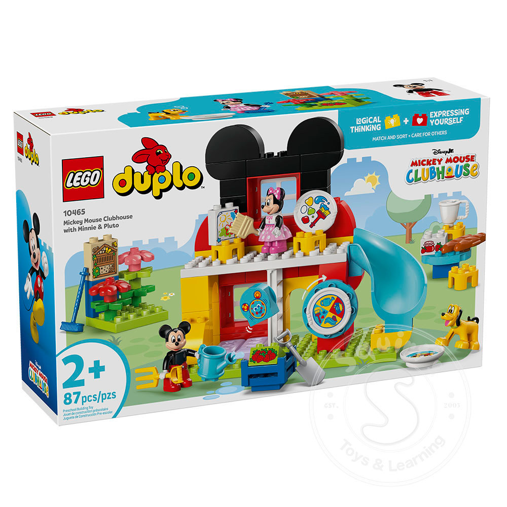 bug hotel, tablesand chairs, and a special door for Pluto. It includes LEGO ǀ Disney characters Mickey Mouse, Minnie Mouse and Pluto, as well as a Toodles the computer decorated brick. To kick start the play, toddlers spin the Mousekedoer to decide if the characters sh ould feed Pluto, dig the garden, paint a picture or play on the slide. Or they can enjoy open-ended play exploring this building set’s features. They can imagine growing strawberries or making jam for breakfast. This Disney building toy can help them practice their fine motor skills as they place the tools in the characters’ hands. This educational building toy for toddlers can help young boys and girls to care for others as they feed Pluto or make breakfast for their friends. Contains 87 pieces.