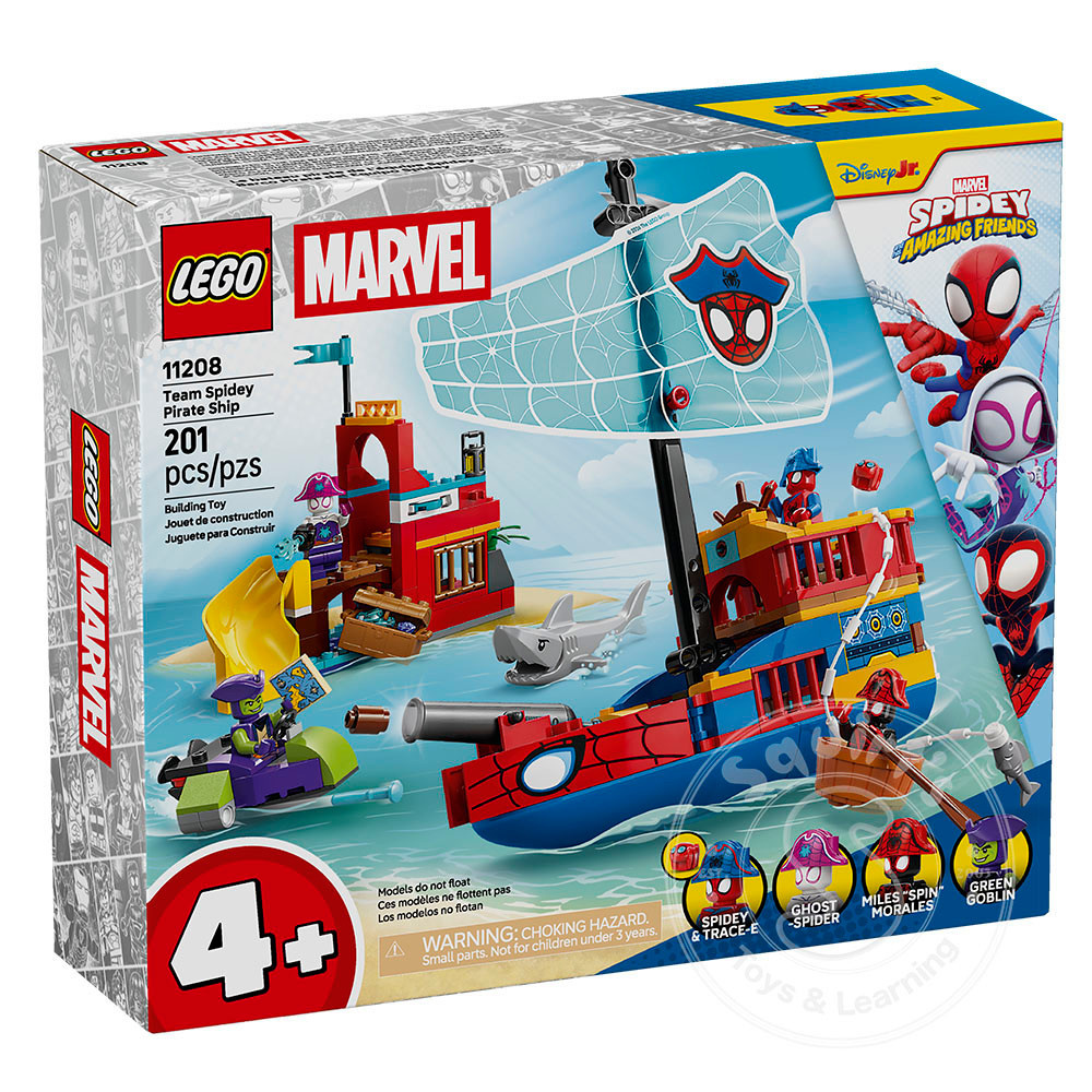 up to develop skills as they explore fun at sea and on Spider Island. This feature-packed Spidey building toy includes a pirate ship, Spider Island with a slide, Green Goblin’s ship and a smaller boat. There’s a cannon on the pirate ship, a disc shooter on the island and shooters on Green Goblin’s ship. Spidey’s web rope can be used to catch a fish, a treasure chest or Goblin's ship. This Spider-Man gift for fans of Spidey And His Amazing Friends comes with colorful pictorial instructions, a Starter Brick and separate bags containing 1 buildable model per bag to make creative construction fast and fun. And, with the LEGO® Builder app, kids can zoom, rotate in 3D and track progress with simple digital instructions. Building set contains 201 pieces.