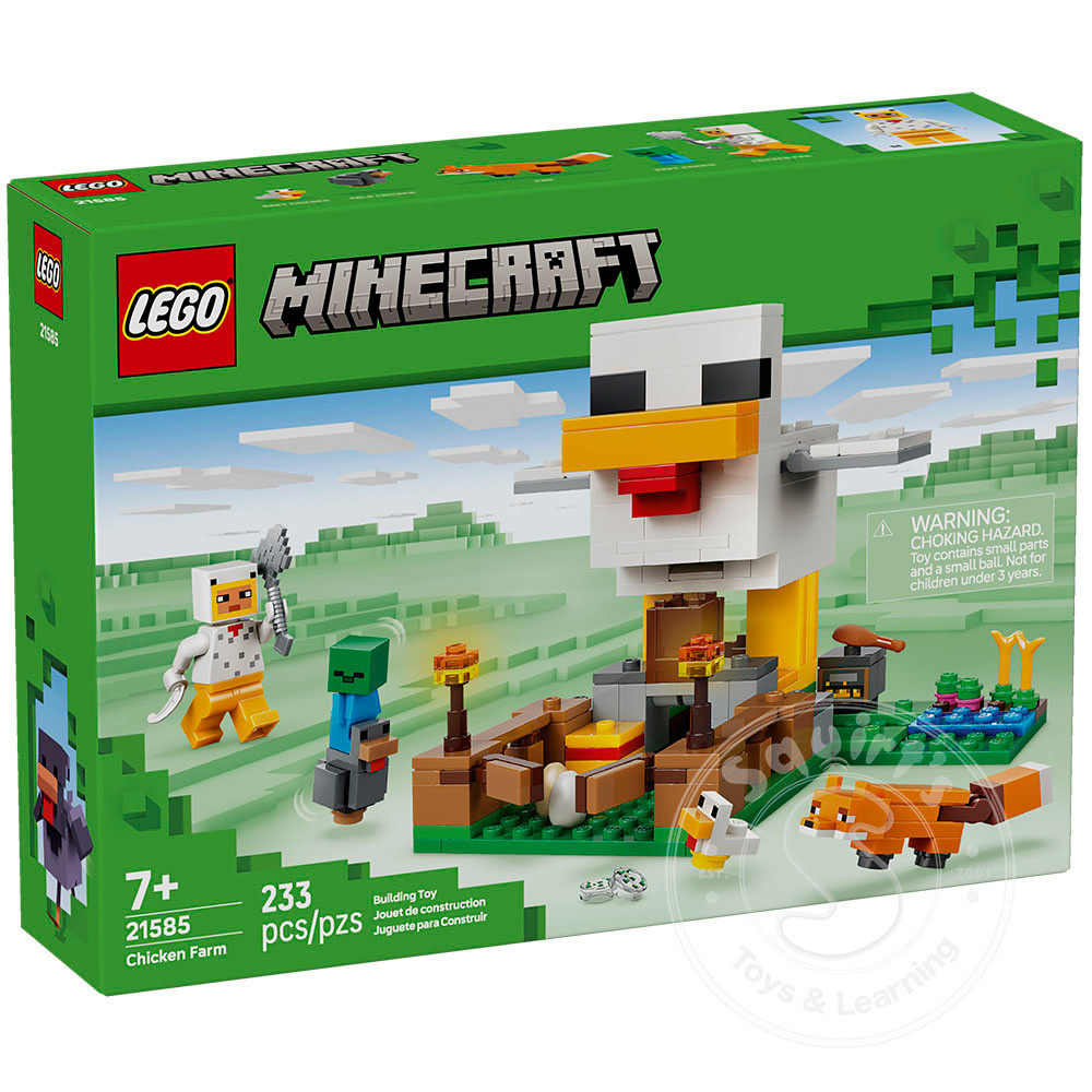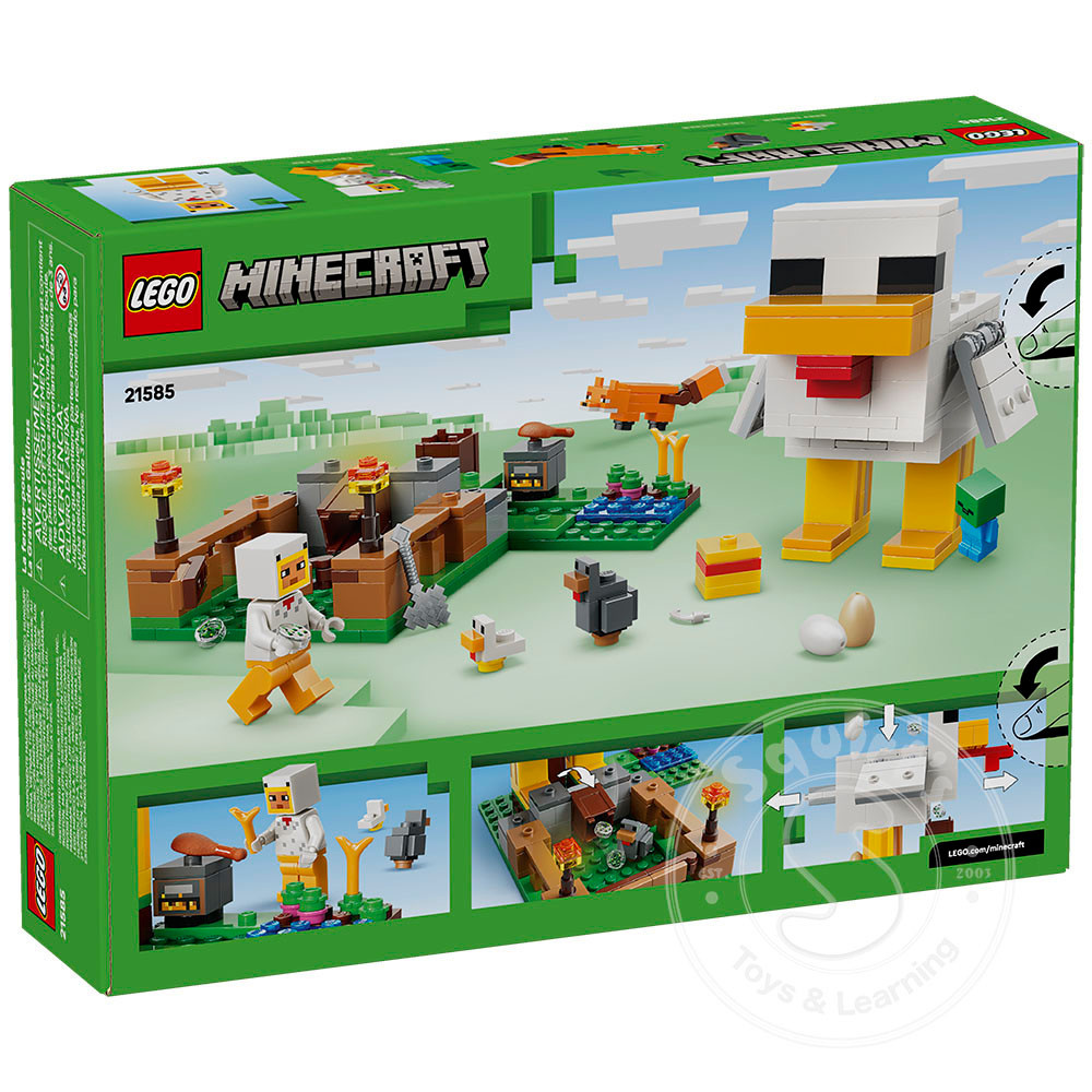 - MINECRAFT® FARM CHARACTERS – The LEGO® Minecraft Chicken Farm (21585) set includes a Chicken Fan minifigure, plus a baby zombie (who likes to ride the chicken), fox, cold chicken and a baby chicken