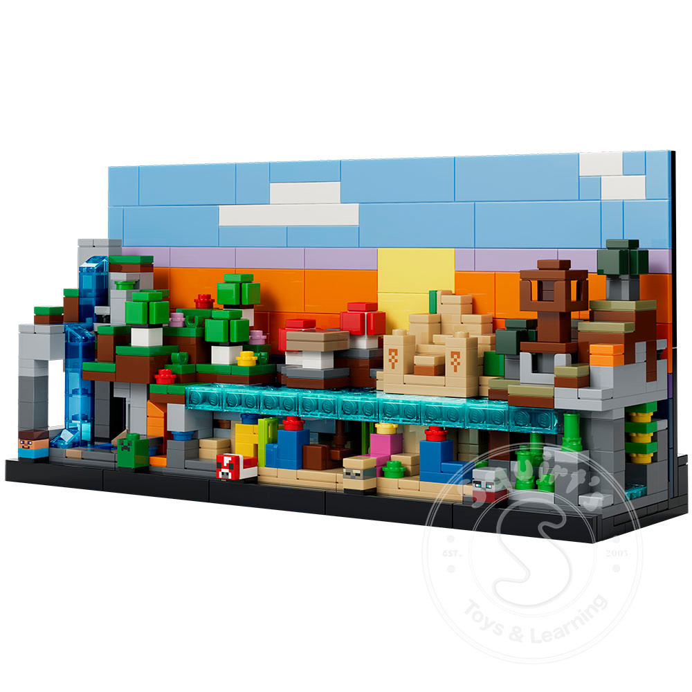 Steve, Creeper™, mooshroom, husk and a pillager. The LEGO Minecraft set has 5 removable biomes: mountain – with dripstone cave, amethyst geode and waterfall; flower forest – with a cave, lava and gold; mushroom fields – with a coral reef, shipwreck, 2 red mushroom trees and a brown mushroom; desert – with a temple, coral reef, ocean, cacti and treasure chest; and savanna – with a pillager outpost, lush cave, acacia trees, pumpkin, lava and beach. Also includes a reversable (day/night-time) backdrop.