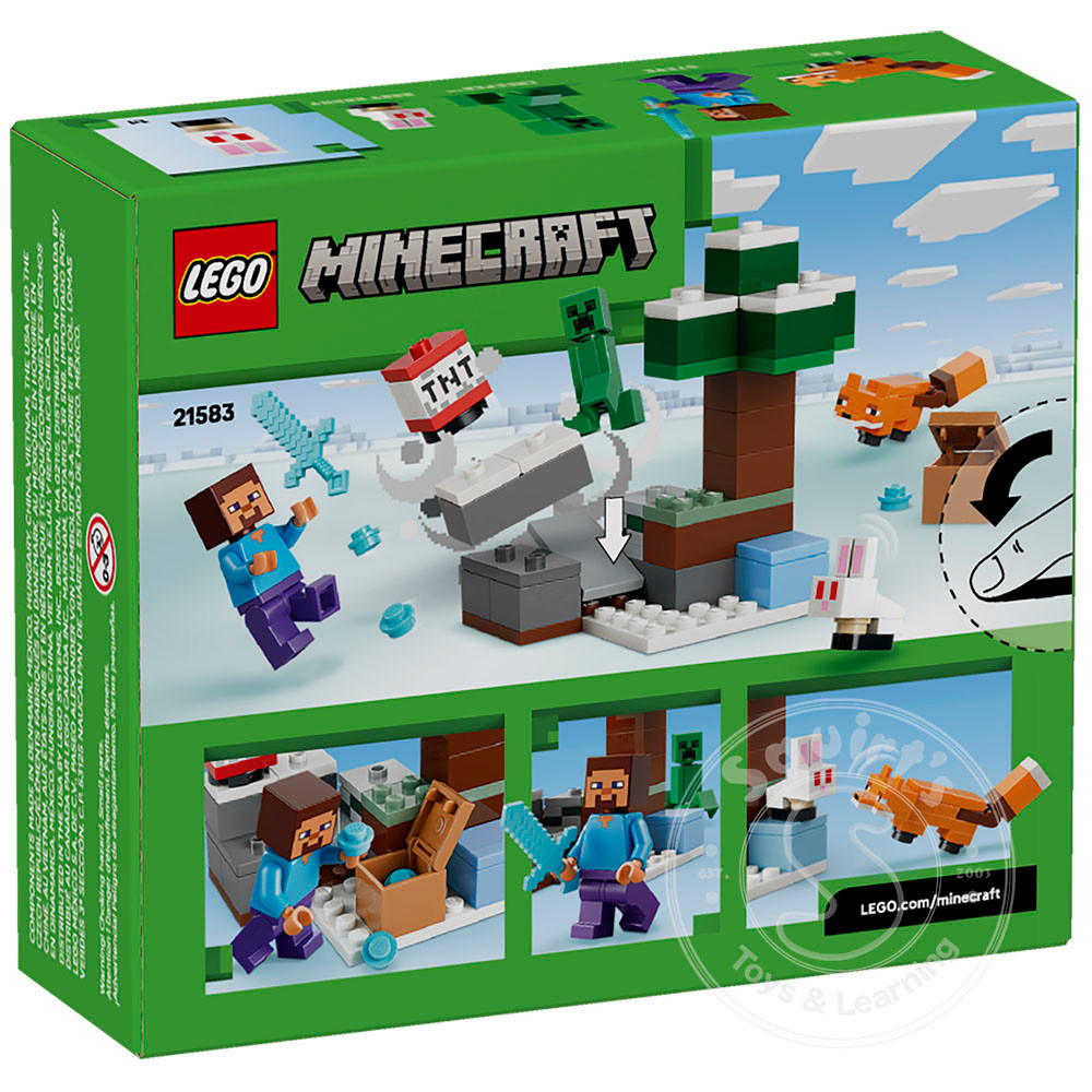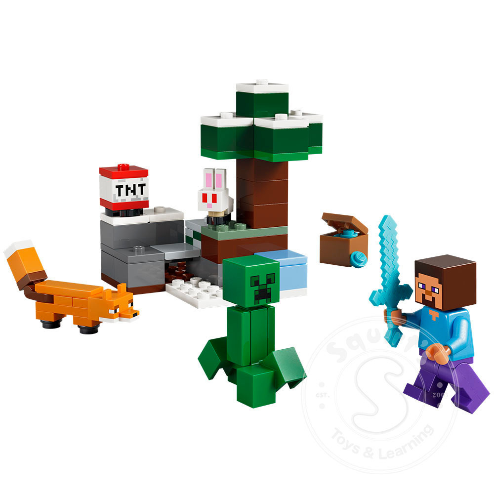 to explore with a Steve minifigure, plus a Creeper™, fox and a baby bunny LEGO figures. Kids join one of the game's heroes, Steve, as he mines diamonds in the Minecraft taiga biome, with its distinctive spruce tree, snow and taiga grass. TNT and an explosion function blast the rocks apart to reveal diamonds, which can be stored in a treasure chest. There’s also a hostile Creeper to fend off using Steve’s diamond sword.