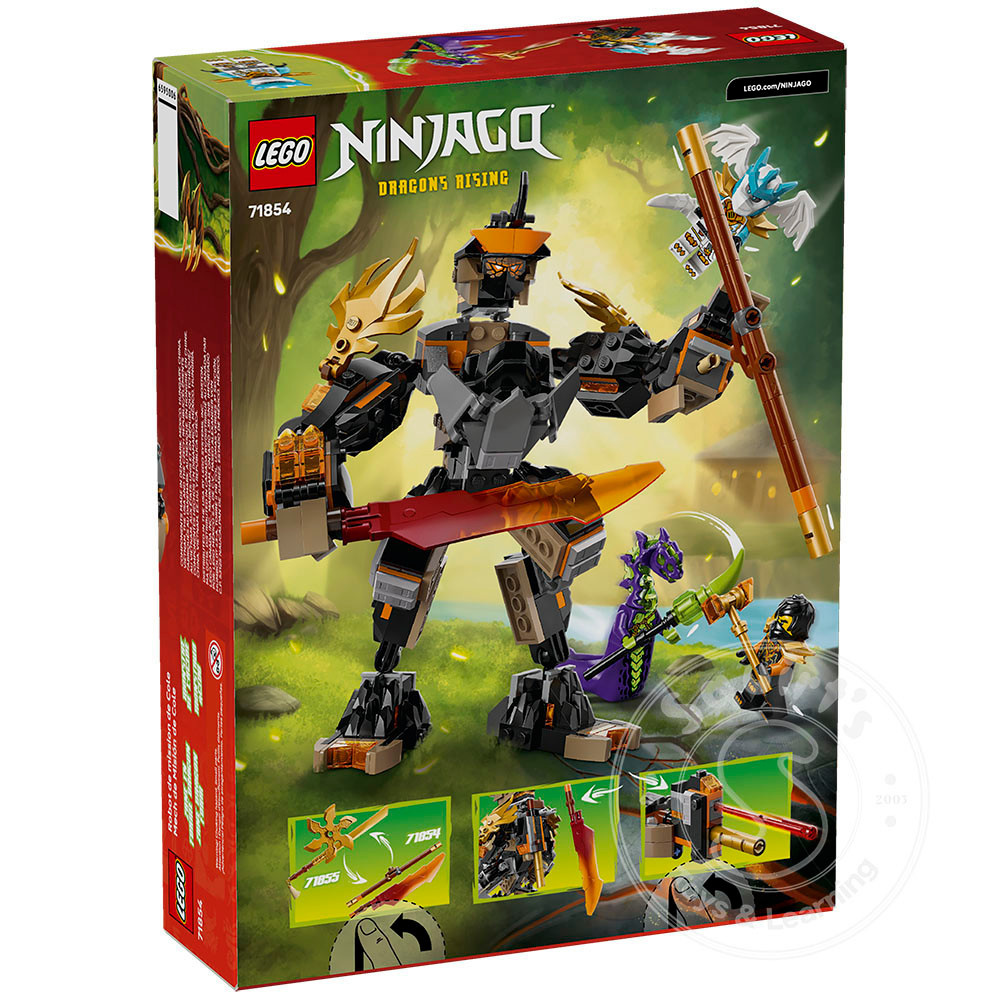 arms, shoulder armor, fingers, legs and ankles, plus a cockpit to place a minifigure inside. The mech comes with 3 weapons: a sword, a staff and a spring-loaded blaster with 2 darts, which kids can swap with weapons from the Riyu Ninja Dragon (71855) set (sold separately). This NINJAGO toy also comes with 3 minifigures: Cole with a hammer accessory, Zane Dragon Form with a sword and an Acid Monster with a staff for role-play battles. The LEGO NINJAGO range of building sets for kids includes mechs, dragons and temples for fans to enjoy ninja action. Kids can build each playset with confidence using the LEGO Builder app – zoom, rotate in 3D and track progress with easy-to-follow digital instructions. Set contains 364 pieces.