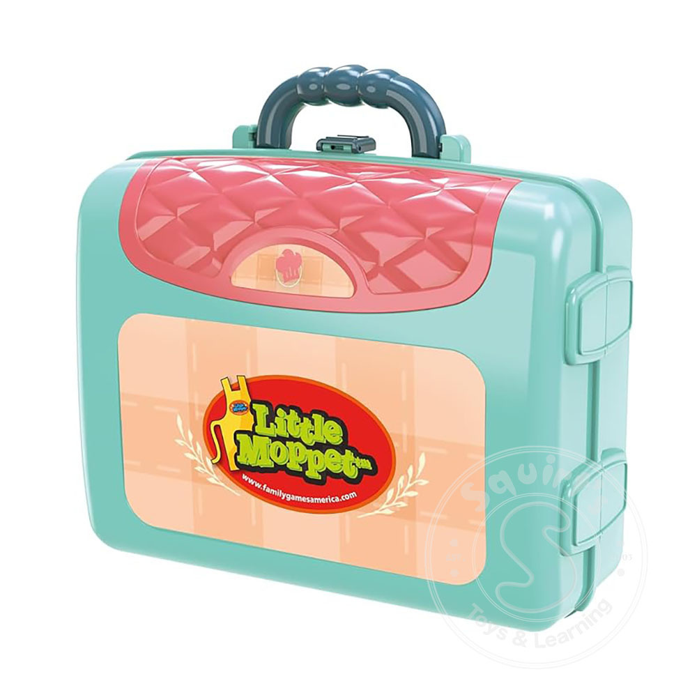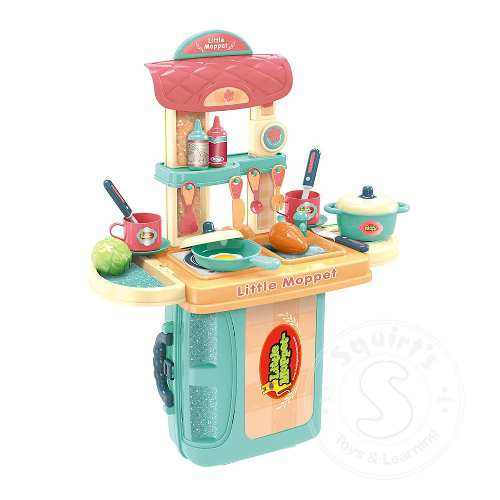 Sturdy aqua and peach 10.5 x 8.75 x 4" Kitchen carry case opens and expands into a sink and stove top surface, then into a 20" tall vertical cooking station. Includes: Seven kitchen utensils, pot and lid, pan and lid, shelves, 2 mugs, fry top...