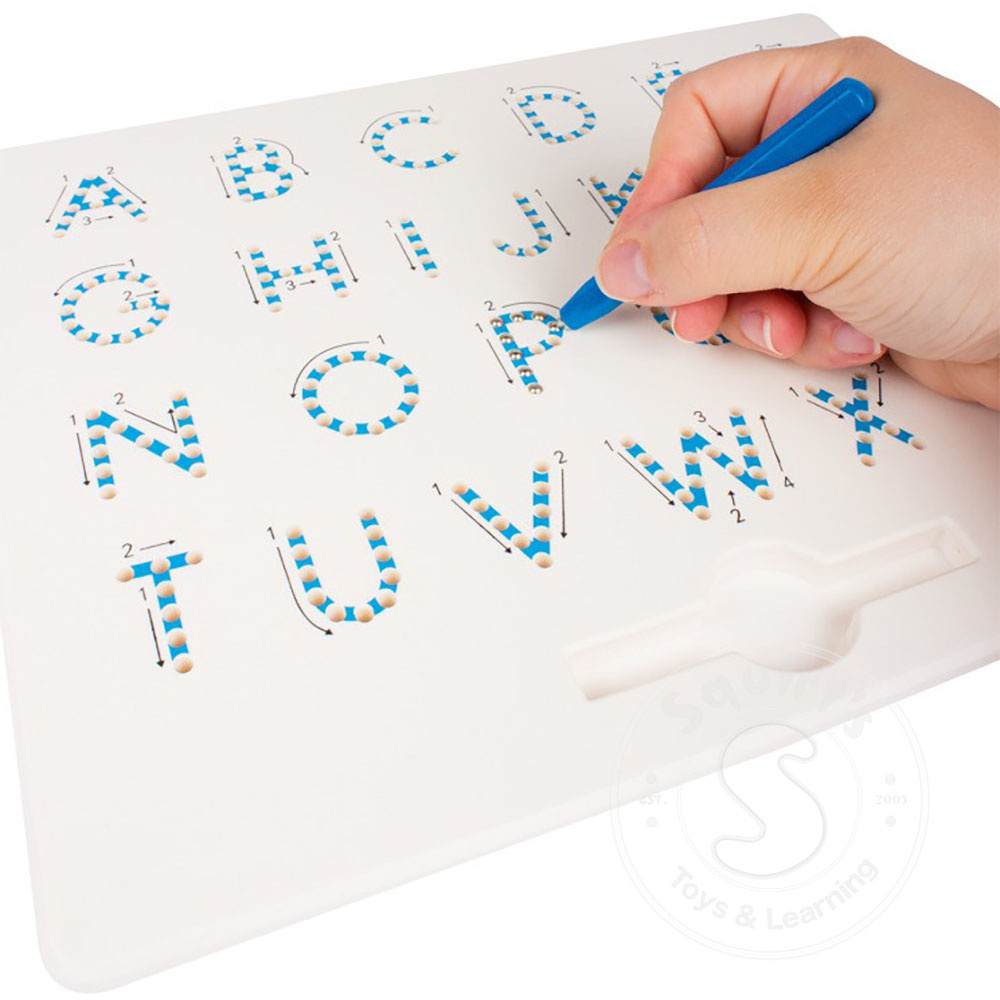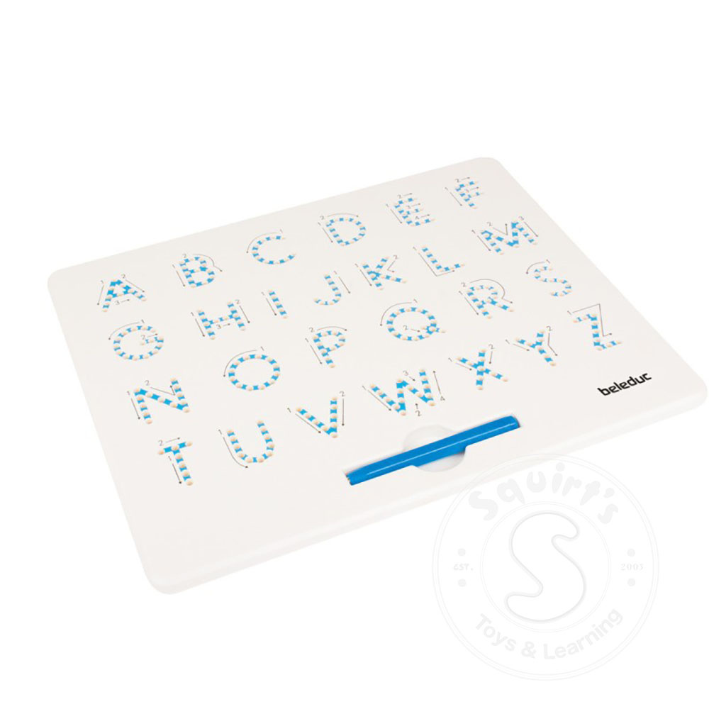 Learning to write letters without pen and paper! Metall balls can be shaped into all upper case letters with the aid of the magnetic pen. This way write beginners can learn how letters are written. Afterwards the balls can just be pushed into the board...